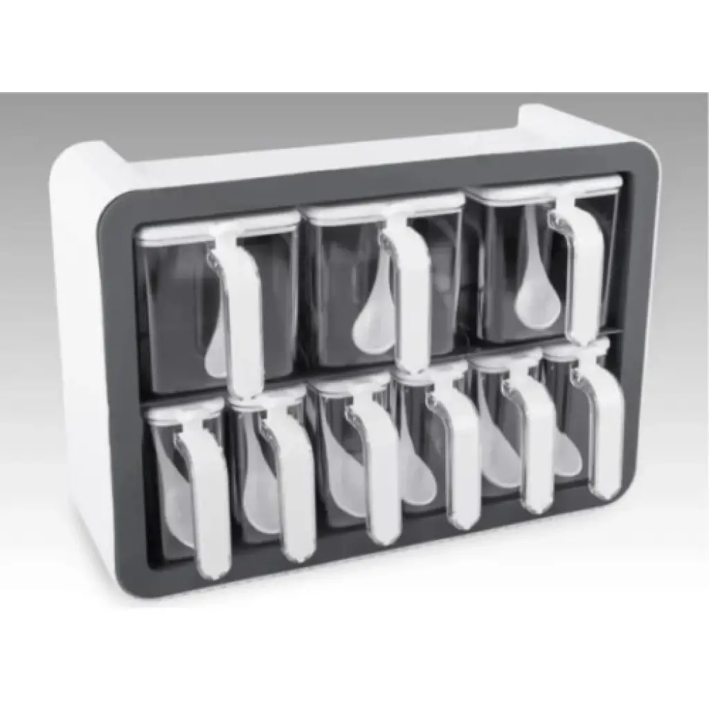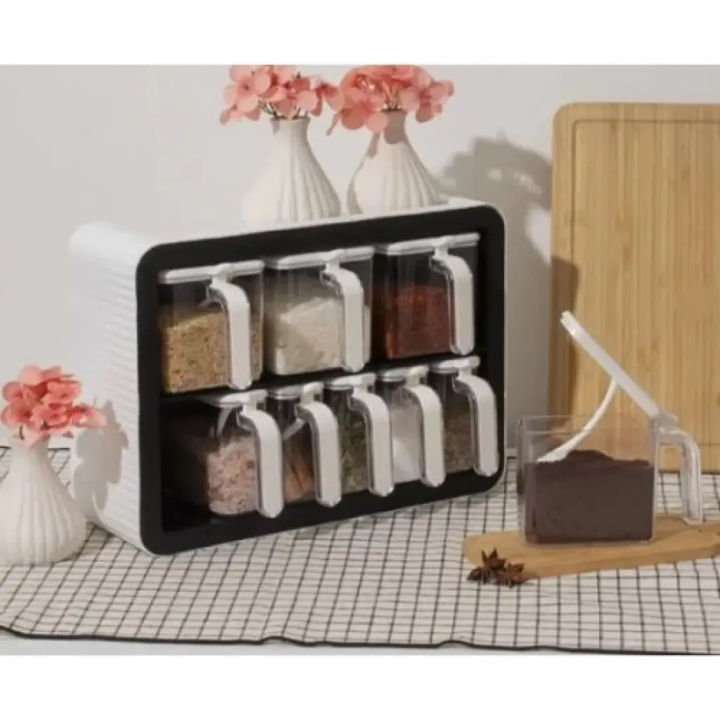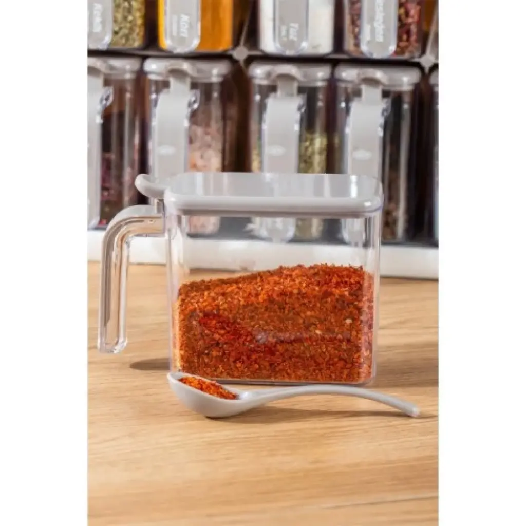 9'LU STANDLI KAŞIKLI BAHARATLIK SETİÜrün Özellikleri9'lu Standlı Kaşıklı Baharatlık Seti, mutfak düzenini sağlamak ve kullanım kolaylığı sunmak için tasarlanmıştır. 9 farklı bölmesi sayesinde baharatlarınızı düzenli bir şekilde saklayabilirsiniz. Kapaklı kaşık tasarımı, hem ölçüm hem de hijyen sağlar. Şeffaf kaplar, baharatların kolayca görülebilmesine olanak tanır. Dayanıklı ve kaliteli plastik malzemeden üretilmiş bu set, uzun ömürlüdür ve gıda ile temasa uygundur. Kompakt stand tasarımı sayesinde mutfak tezgahında yerden tasarruf sağlar ve modern bir görünüm sunar. Kolayca çıkarılabilen parçaları sayesinde temizlik oldukça rahattır.Paket İçeriği9 adet Şeffaf Baharat Kabı9 adet Kapaklı Ölçü Kaşığı1 adet Stand