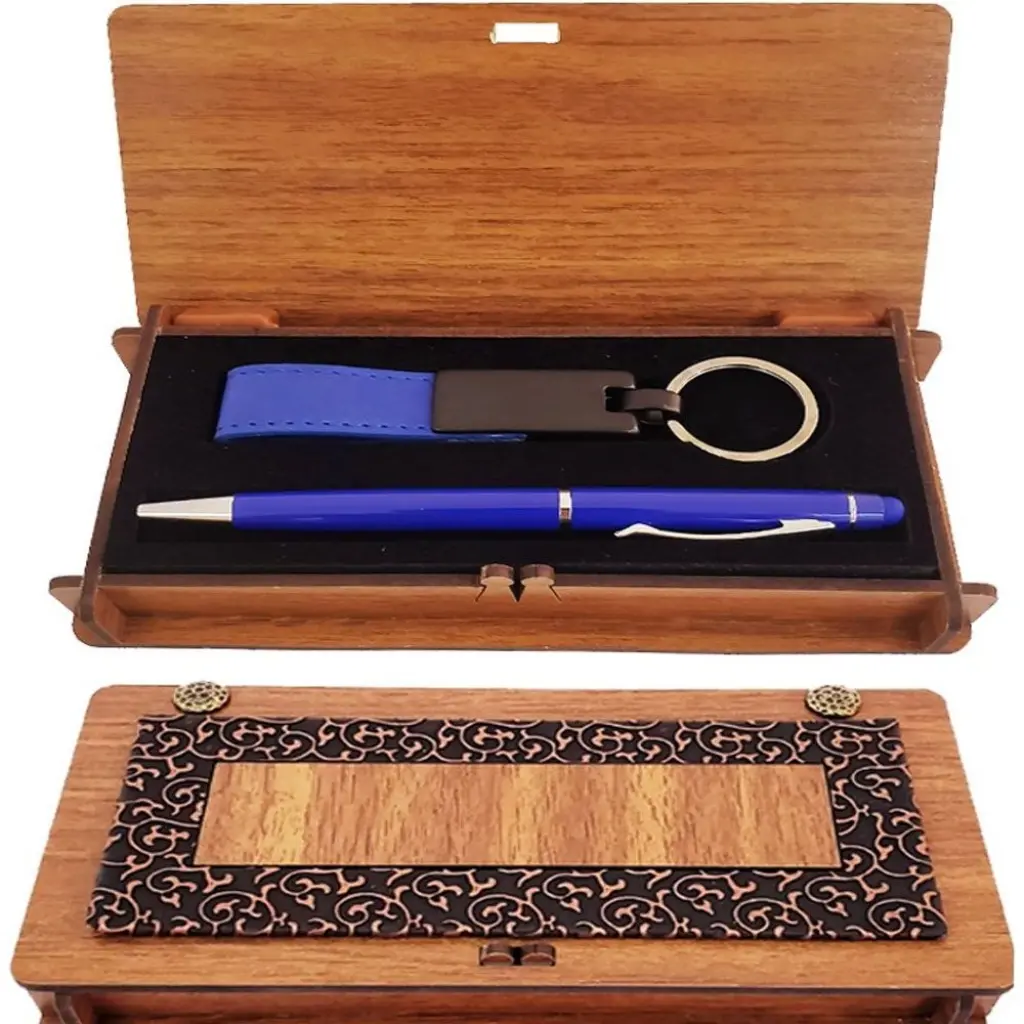 Ahşap Kutulu Koyu Mavi Kalem ve Anahtarlık Set