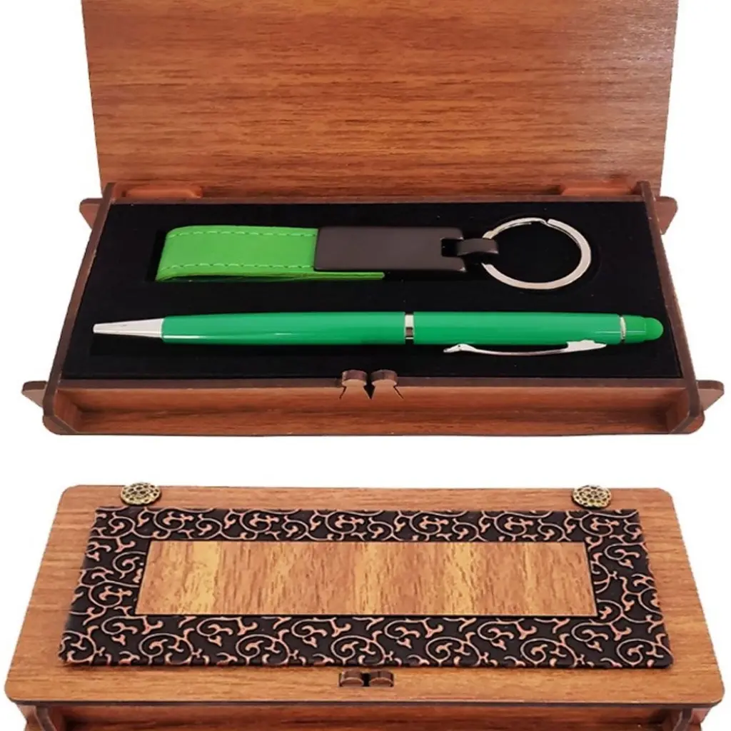 Ahşap Kutulu Yeşil Kalem ve Anahtarlık