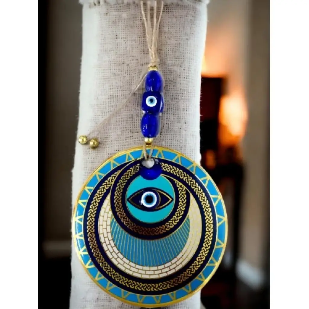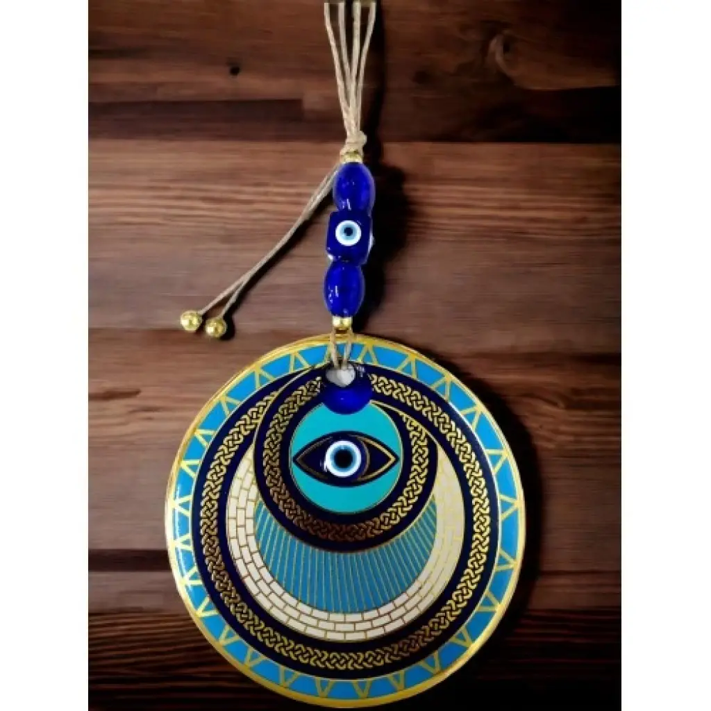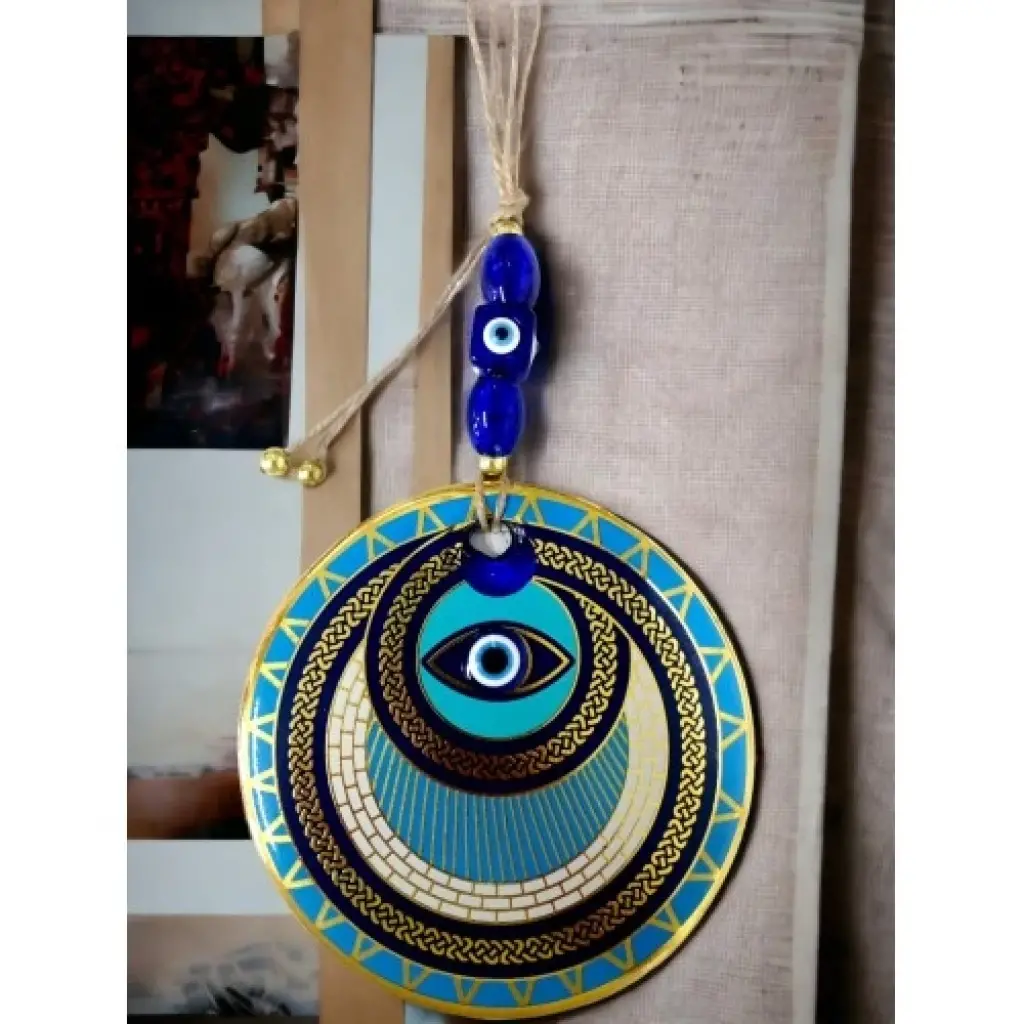 Nazar boncuklu göz duvar süsümüz nazar boncuğu ile süslenmiştir. Ürünümüz mavi cam nazar boncuğundan tamamen el işçiliği ile üretilmiştir. Ürünümüzün yuvarlak kısmı 13 santimetre çapındadır. Duvar süsümüz ip dahil yaklaşık 30 santimetre boyundadır.El yapımı füzyon cam sanatının en güzel örneklerinden biri olan halka tasarım nazarlık, kötü gözlerden korunmak isteyenler için ideal bir seçenek. Duvarınıza asarak evinizde pozitif bir enerji oluşturabilirsiniz.