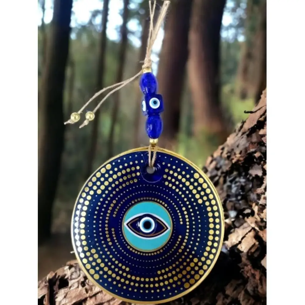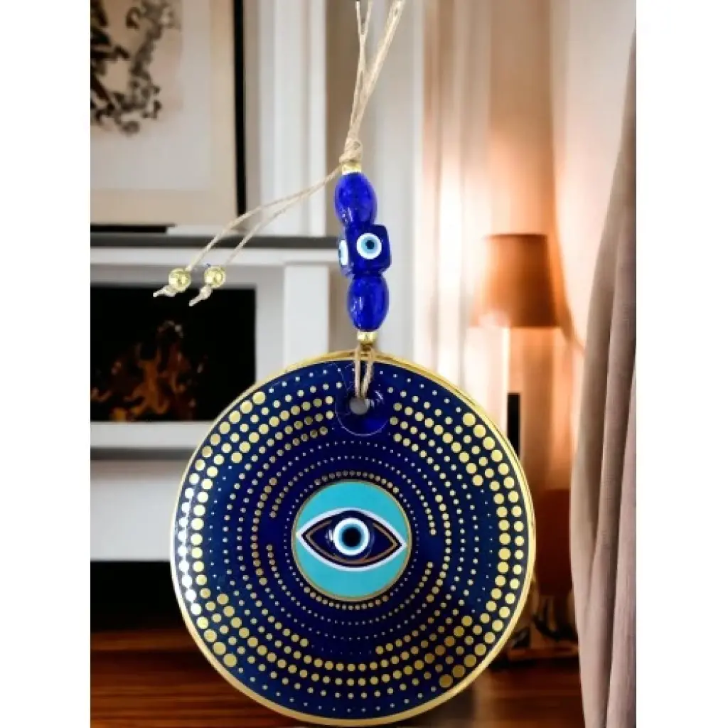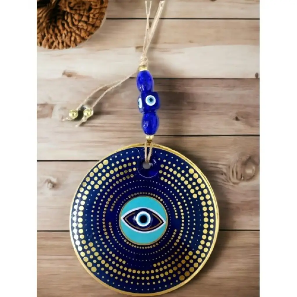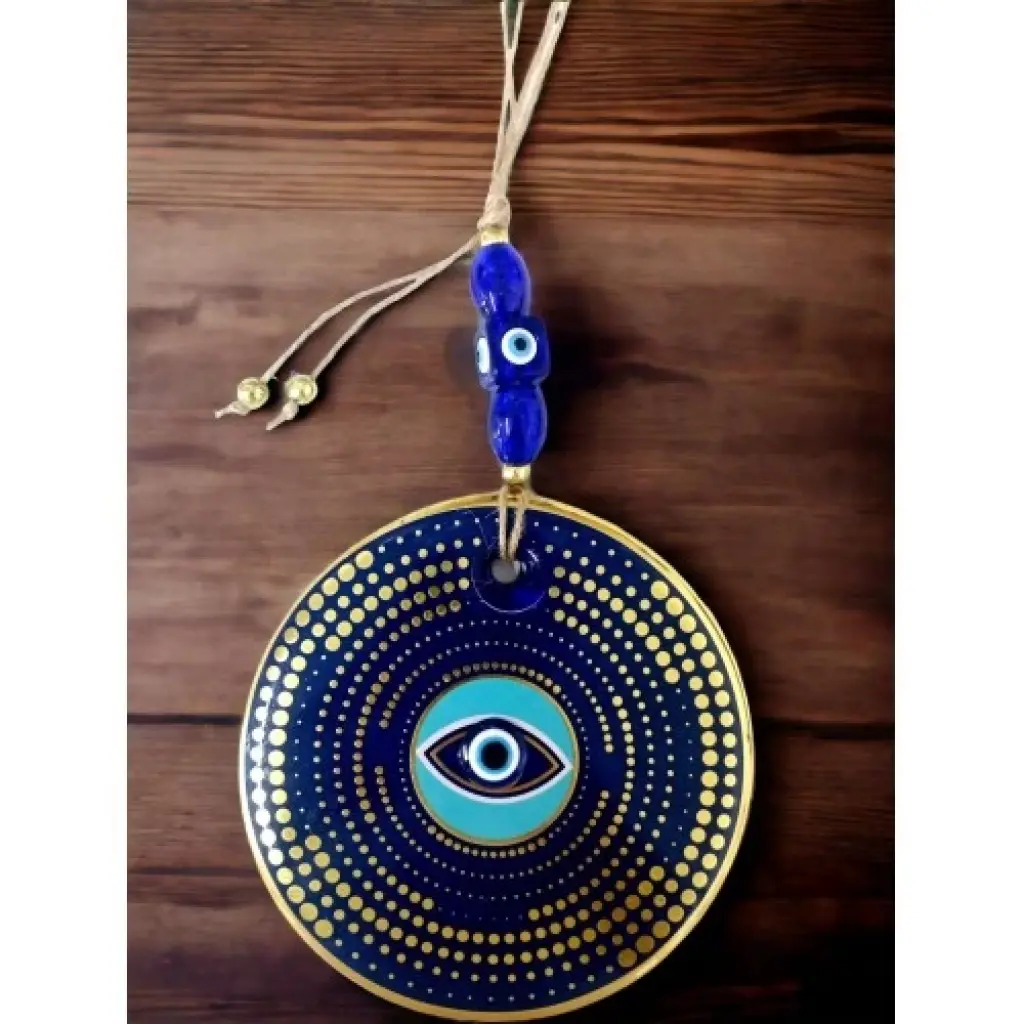Nazar boncuklu göz duvar süsümüz nazar boncuğu ile süslenmiştir. Ürünümüz mavi cam nazar boncuğundan tamamen el işçiliği ile üretilmiştir. Ürünümüzün yuvarlak kısmı 13 santimetre çapındadır. Duvar süsümüz ip dahil yaklaşık 30 santimetre boyundadır.El yapımı füzyon cam sanatının en güzel örneklerinden biri olan puantiyeli nazarlık, kötü gözlerden korunmak isteyenler için ideal bir seçenek. Duvarınıza asarak evinizde pozitif bir enerji oluşturabilirsiniz.