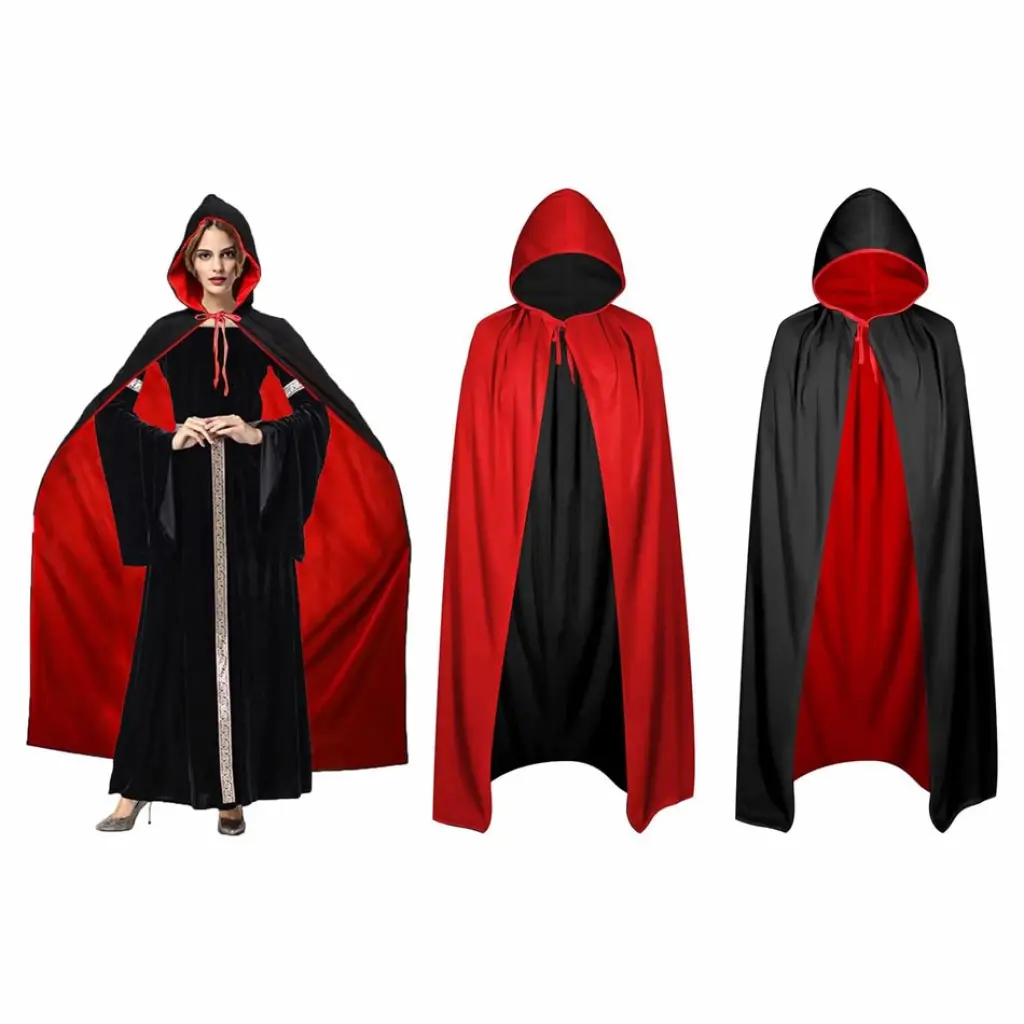 Çift Taraflı Kullanılabilir Siyah Kırmızı Kapişonlu Pelerin 140 cm Yetişkin, kostüm partileri, cosplay veya diğer özel günlerde eğlenceli ve gizemli bir görünüm elde etmek isteyenler için mükemmel bir seçimdir. Siyah ve kırmızı olmak üzere iki farklı rengi ile kullanılabilen bu pelerin, size birçok farklı kostüm seçeneği sunar. Kapüşonu ve uzun boyu ile de gizemli bir hava katacaktır.