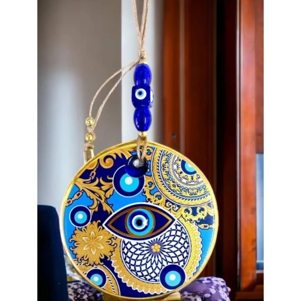 Nazar boncuklu göz duvar süsümüz nazar boncuğu ile süslenmiştir. Ürünümüz mavi cam nazar boncuğundan tamamen el işçiliği ile üretilmiştir. Ürünümüzün yuvarlak kısmı 13 santimetre çapındadır. Duvar süsümüz ip dahil yaklaşık 30 santimetre boyundadır.Geleneksel Türk sanatlarını modern tasarımlarla birleştiren bu duvar süsü, hem estetik hem de anlamlı bir hediye seçeneği. Nazar boncuğunun koruyucu özelliğiyle birleşen çini ve altın detayları, bu ürünü benzersiz kılıyor.