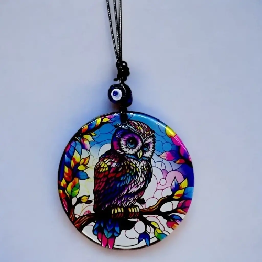 Dalda baykuş resimli duvar süsümüz tamamen el işçiliği ile üretilmiştir. Tasarım harikası el yapımı baykuş resimli duvar süsümüz 12 santimetre çapındadır. Ürünümüz ip dahil 25 santimetre boyundadır.
