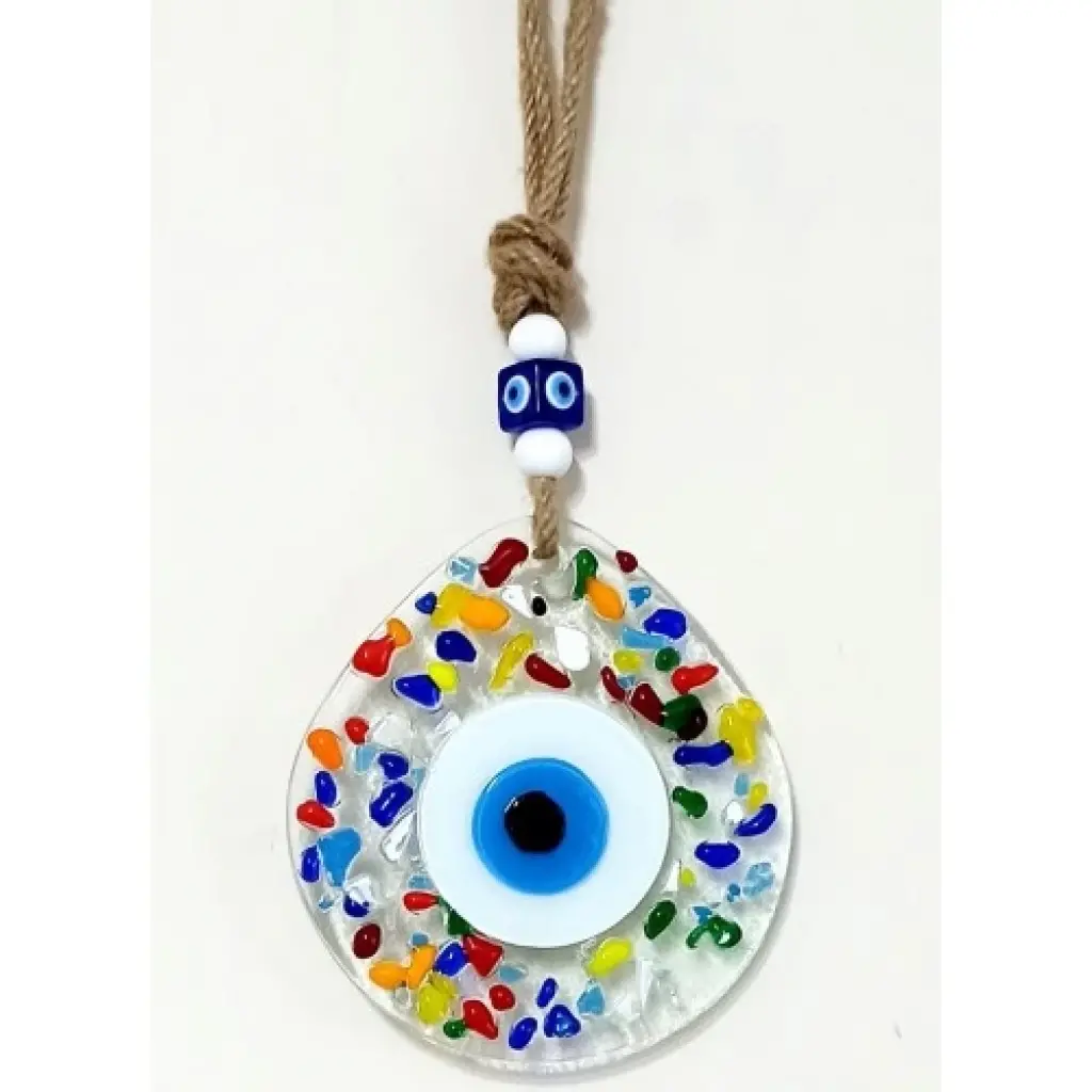 Gökkuşağı renklerinde süslenmiş şeffaf cam duvar süsümüz damla model olup el yapımıdır. Duvar süsümüz 12 cm eninde, 13 cm boyundadır. Ürünümüz ip dahil 26 cm boyundadır.
