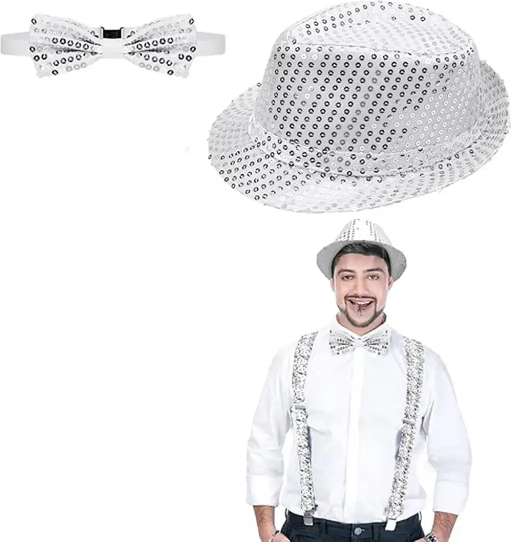 Göz alıcı bir tarz oluşturmak isteyenler için Gümüş Payetli Şapka ve Papyon Seti tam size göre! Işıltılı tasarımıyla özel davetlerden temalı partilere kadar her ortamda fark yaratın.