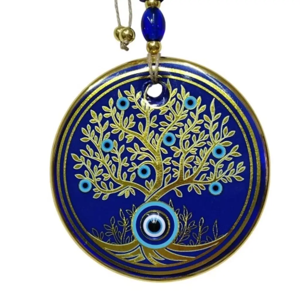 Hayat ağacı duvar süsümüz nazar boncuğu ile süslenmiştir. Ürünümüz mavi cam nazar boncuğu kullanılarak el işçiliği ile üretilmiştir. Ürünümüzün yuvarlak kısmı 13 santimetre çapındadır. Duvar süsümüz ip dahil yaklaşık 30 santimetre boyundadır.