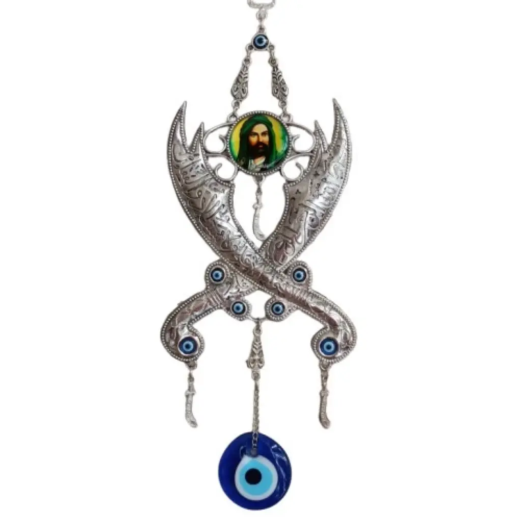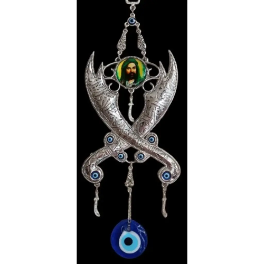 Nikel zamk kaplamalı Zülfikar kılıç dekoru Hz. Ali'nin fotoğrafı ve cam nazar boncukları ile detaylandırılmıştır. Duvar dekorumuz 35 x 11 cm. ölçülerinde özel tasarım olarak üretilmiştir. Zülfikar Kılıç Peygamberimizin Hz. Ali'ye hediyesi olan dünyadaki en ünlü kılıçlardan biridir.