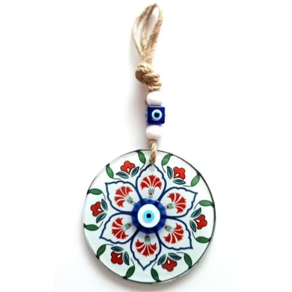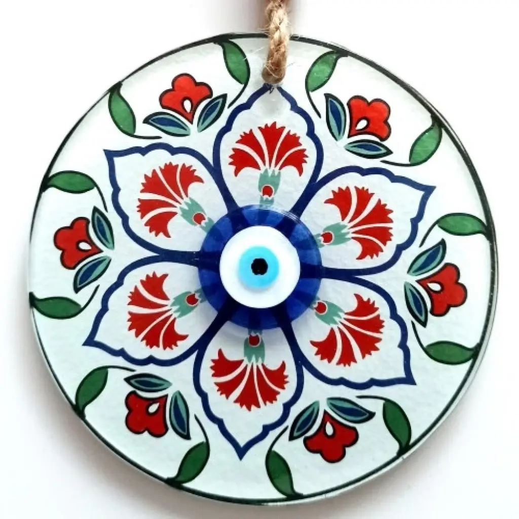 Karanfil desenli füzyon cam duvar süsümüz 12 santimetre çapındadır. Ürünümüz ip dahil 24 santimetre boyundadır. Ürünümüz karanfil ve nazar boncuğu ile süslenmiştir.