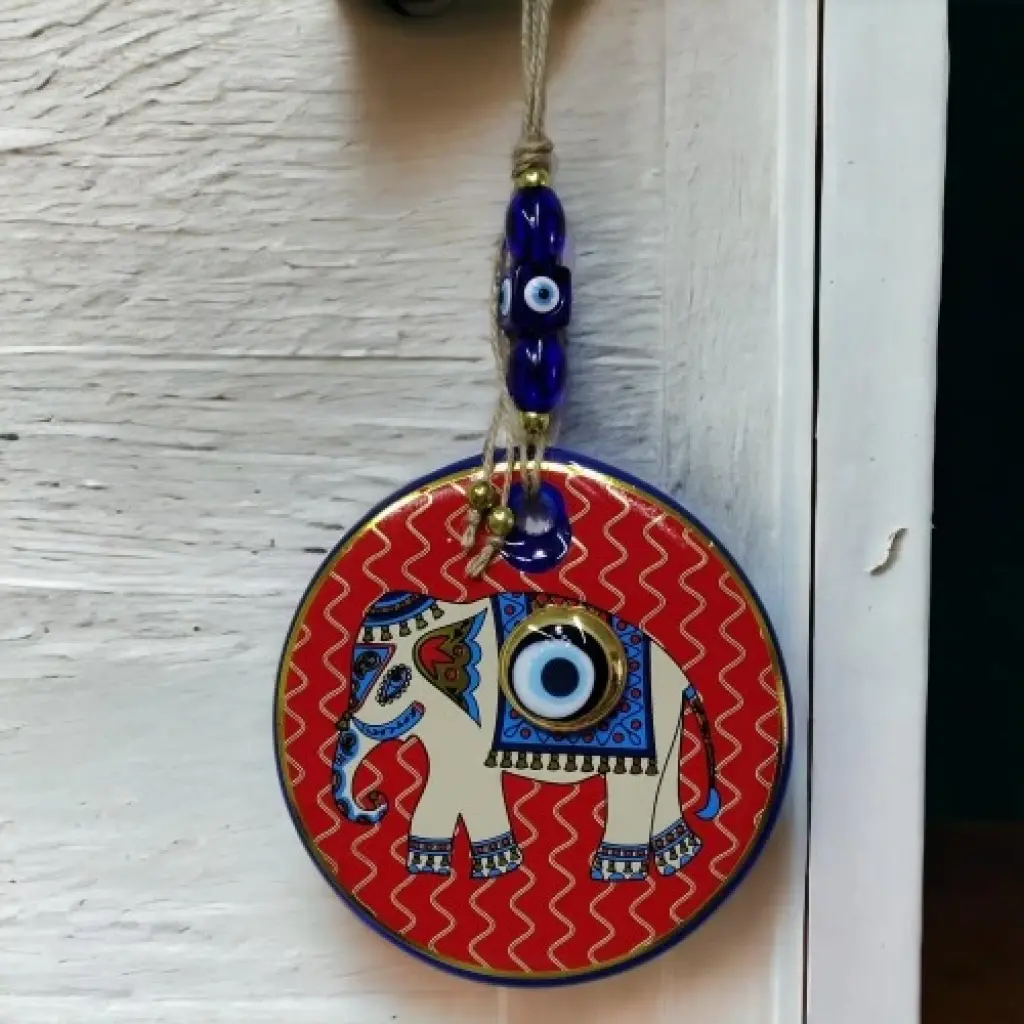 Kırmızı rengi kaplamalı duvar süsümüz nazar boncuğu ile süslenmiştir. Ürünümüz kırmızı cam nazar boncuğundan tamamen el işçiliği ile üretilmiştir. Ürünümüzün yuvarlak kısmı 13 santimetre çapındadır. Duvar süsümüz ip dahil yaklaşık 30 santimetre boyundadır.