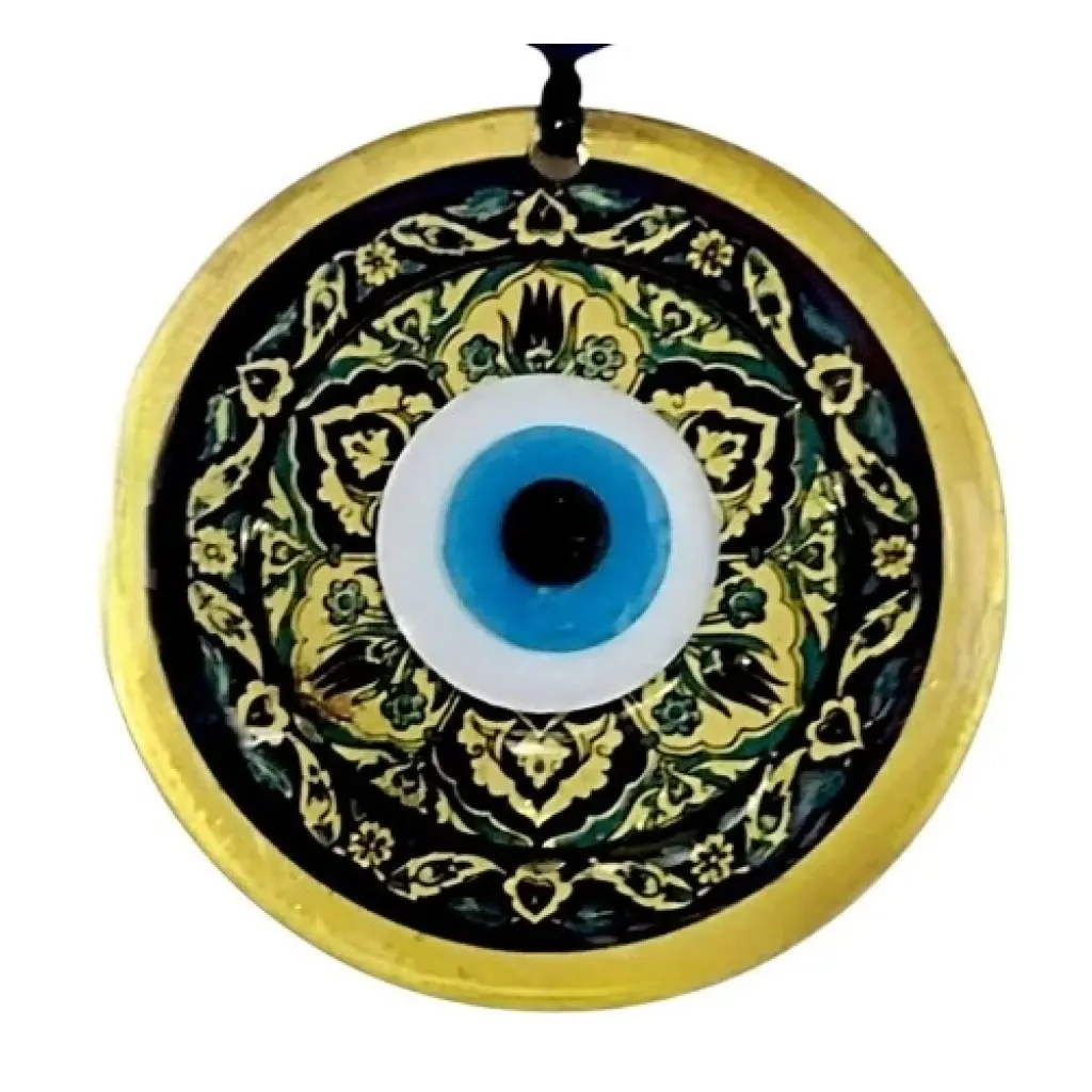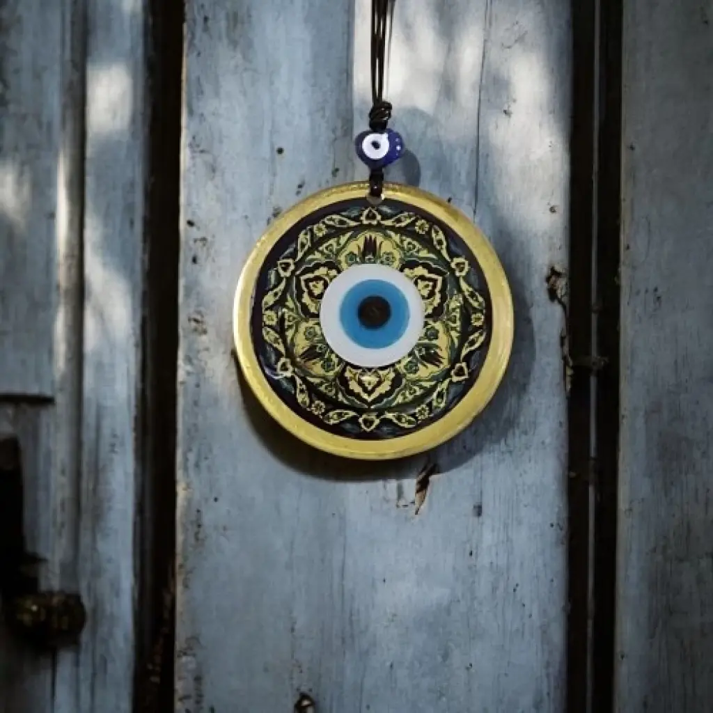 Altın varaklı ve Lale desenli duvar süsümüz tamamen el işçiliği ile üretilmiştir. Nazar boncuklu duvar dekorumuz 12 santimetre Çapındadır. Ürünümüz ip dahil 25 santimetre boyundadır.