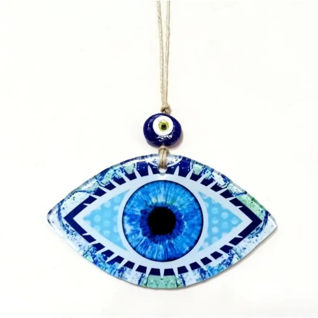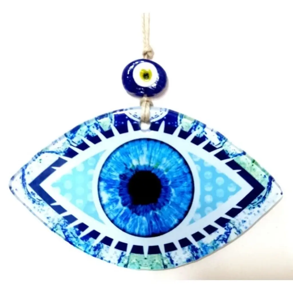 Mavi göz modelli duvar süsümüz 15 santimetre eninde, 8 santimetre boyundadır. Füzyon cam malzeme kullanılarak üretilen duvar süsümüz ip dahil 23 santimetre boyundadır.