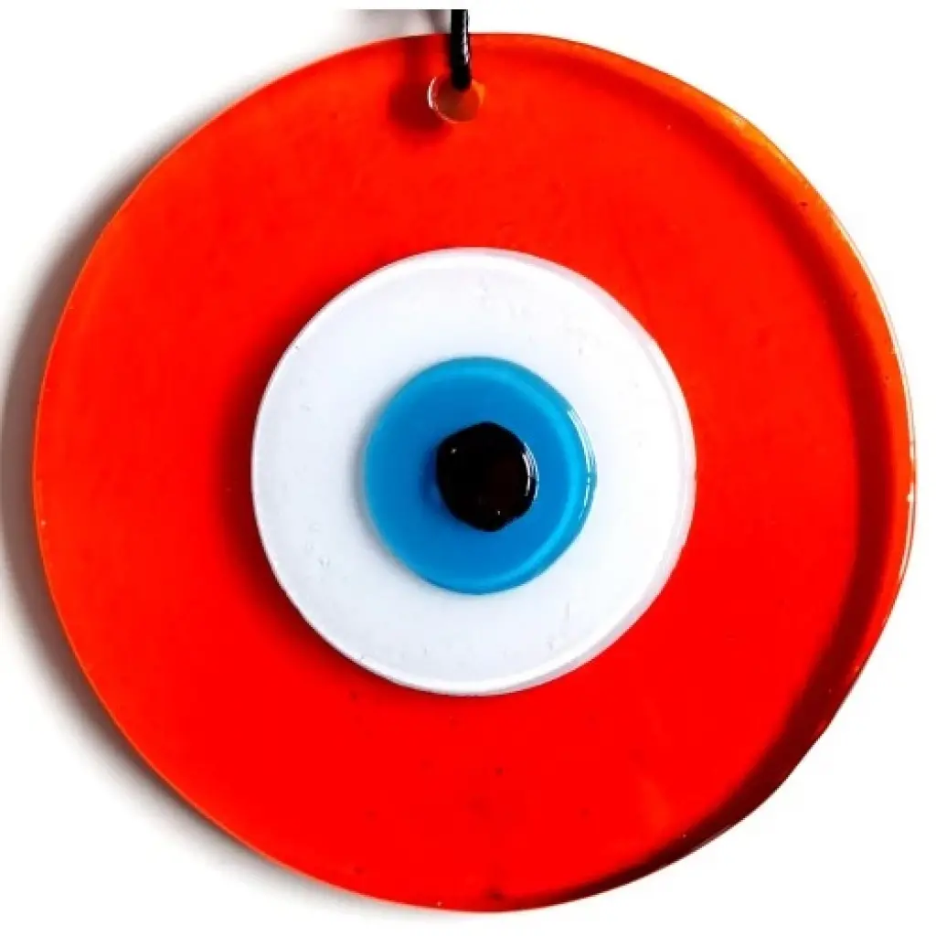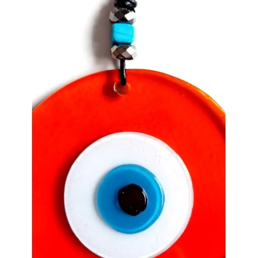 Turuncu renk şeffaf mavi nazar boncuklu duvar süsümüz 12 santimetre çapındadır. İp dahil 22 santimetre boyundadır. El işçiliği olan ürünümüz birinci kalite cam kullanılarak üretilmiştir.