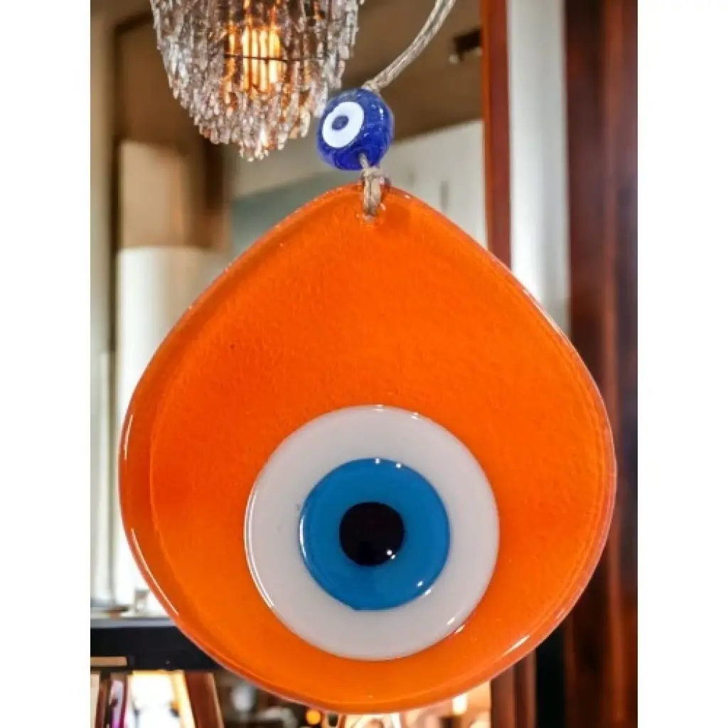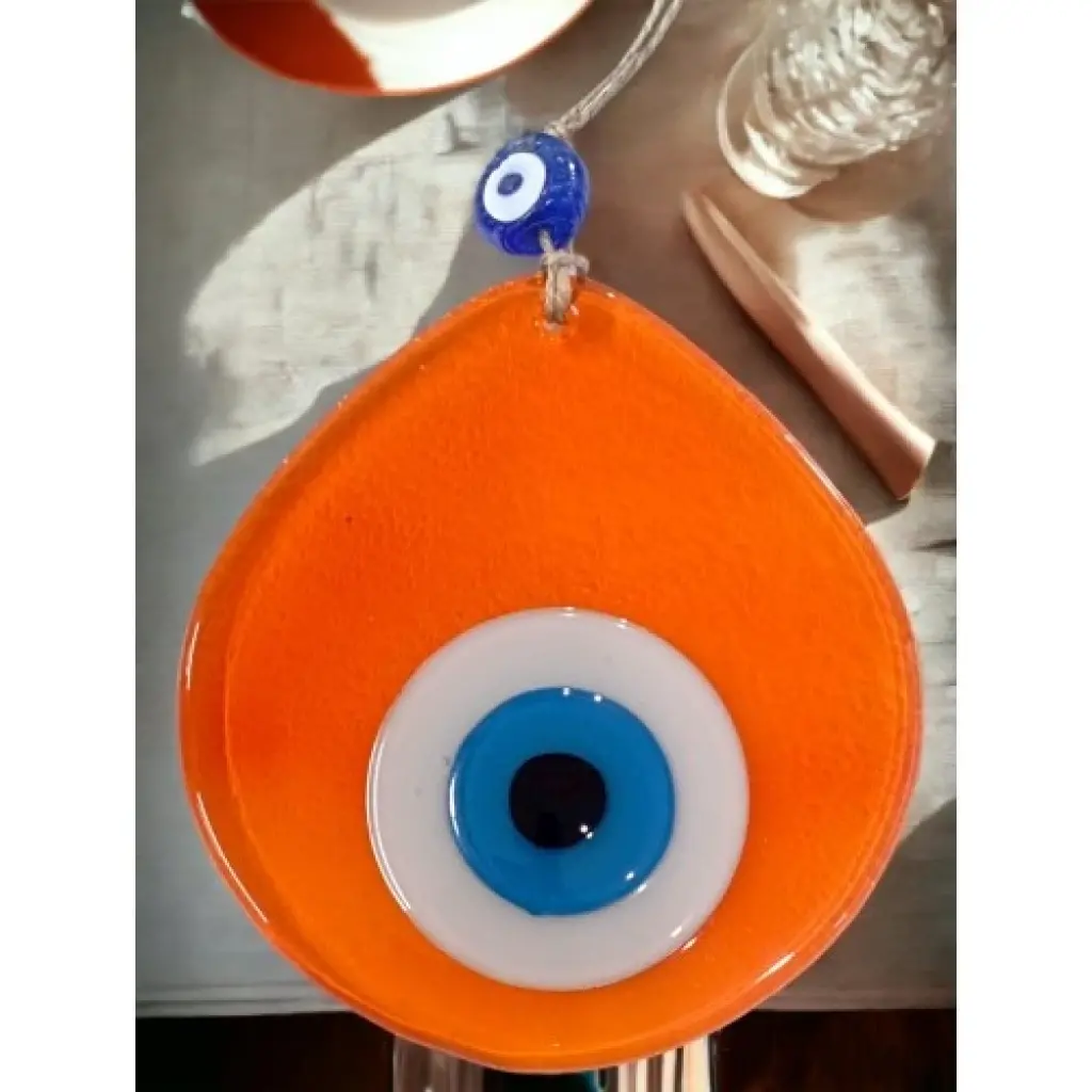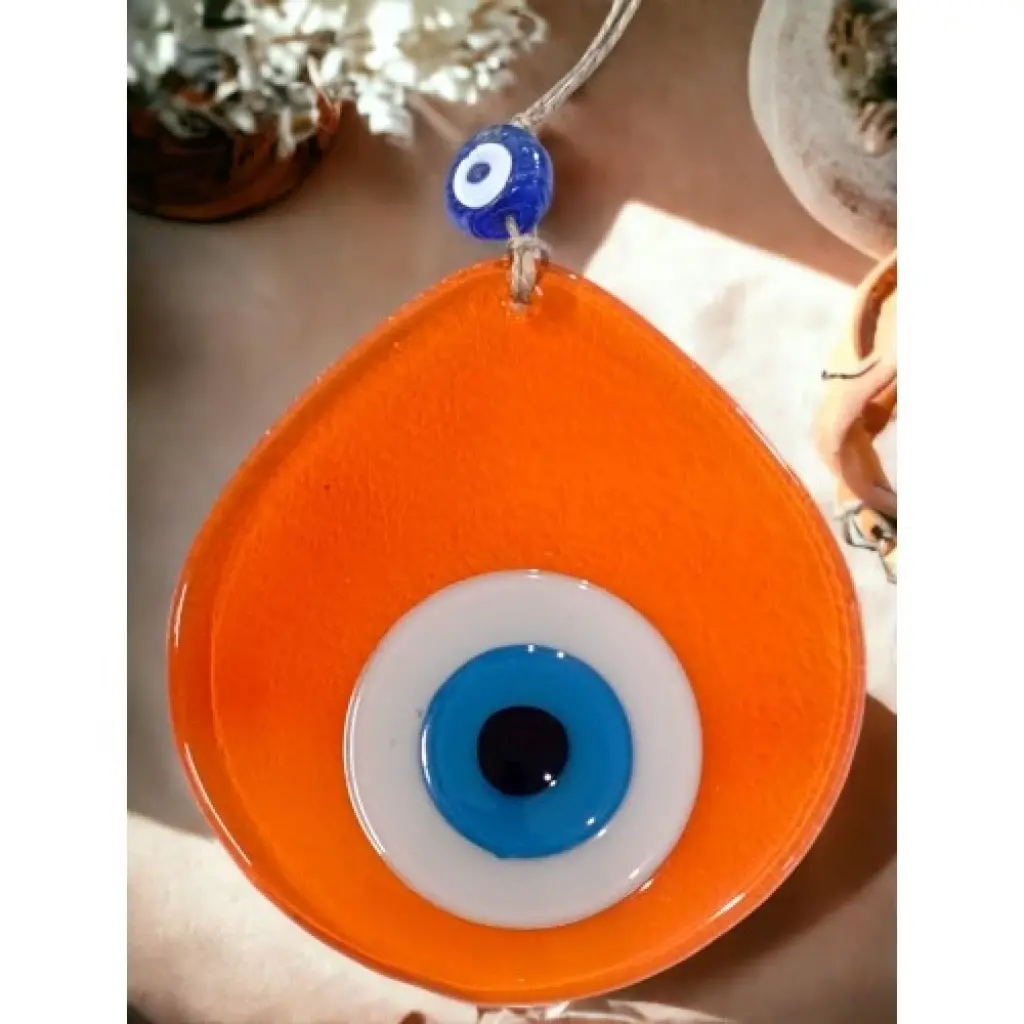 Şeffaf Turuncu renk nazar boncuklu duvar süsümüz tamamen el işçiliği ile üretilmiştir. Tasarım harikası el yapımı nazar boncuklu duvar süsümüz 13 x 12 santimetre ölçülerindedir. Ürünümüz ip dahil 21 santimetre boyundadır.