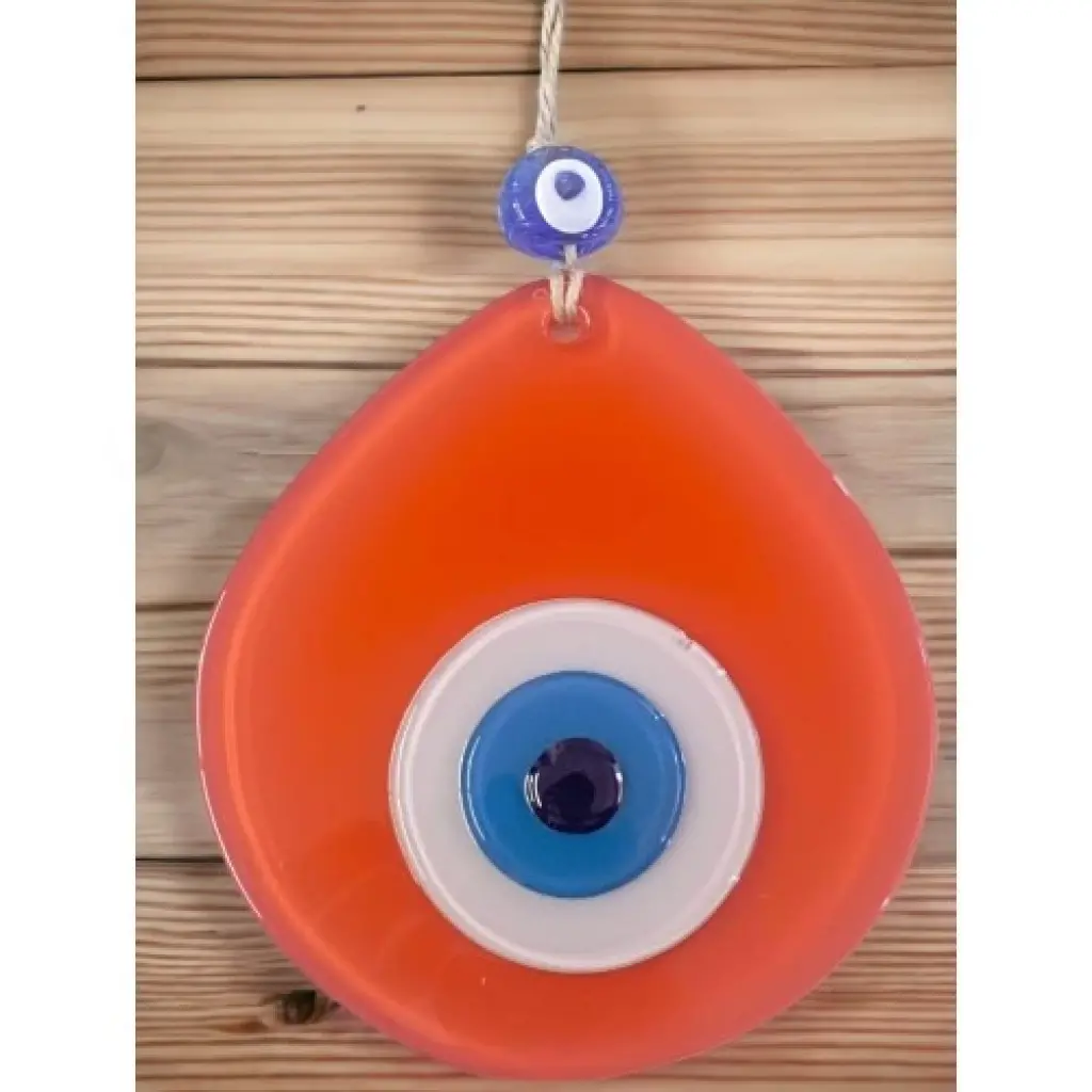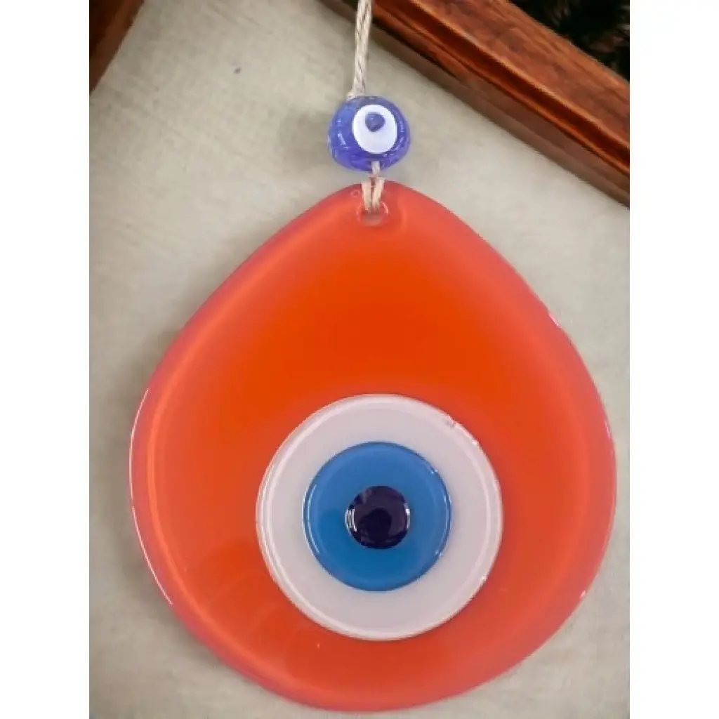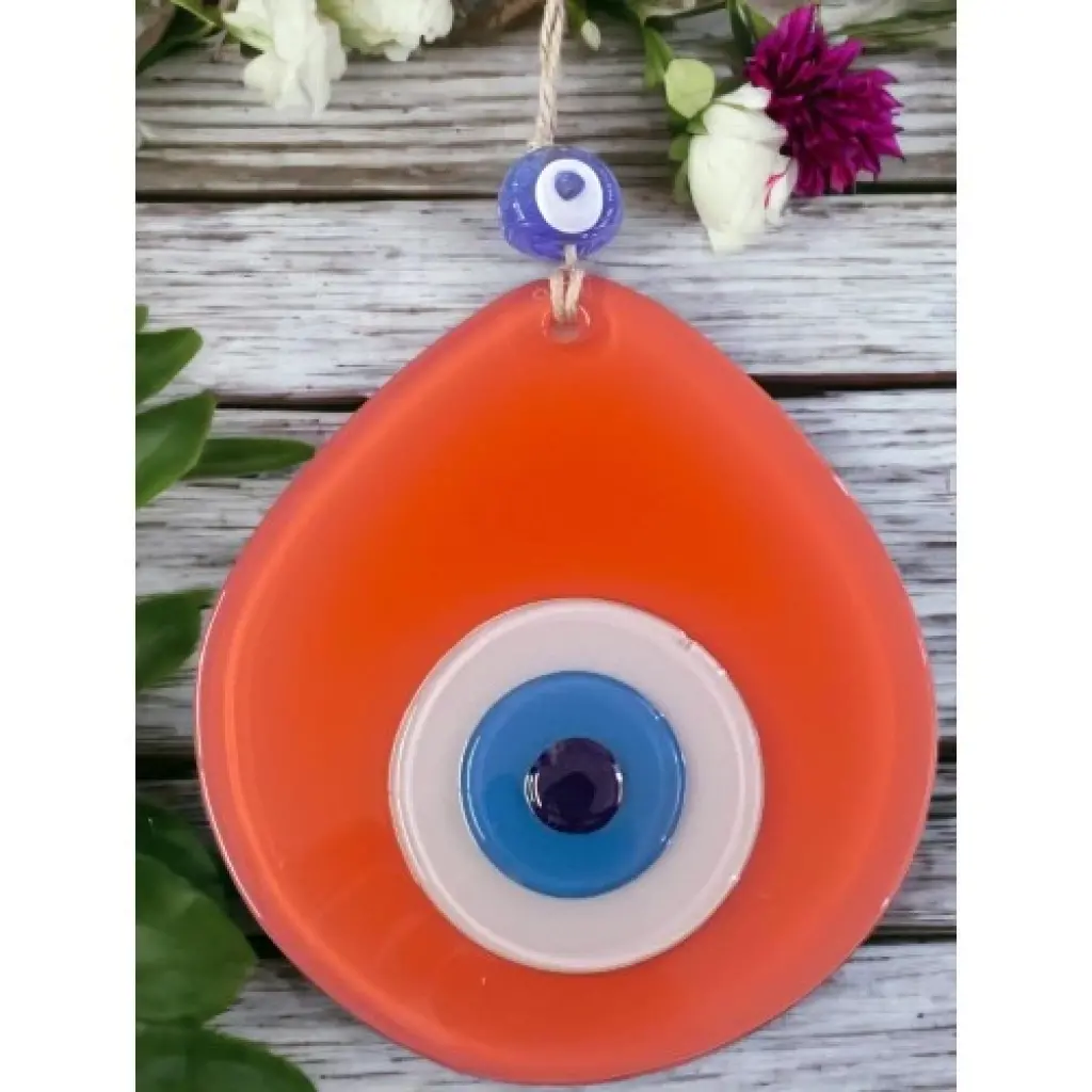 Turuncu renk nazar boncuklu duvar süsümüz tamamen el işçiliği ile üretilmiştir. Tasarım harikası el yapımı nazar boncuklu duvar süsümüz 13 x 12 santimetre ölçülerindedir. Ürünümüz ip dahil 21 santimetre boyundadır.