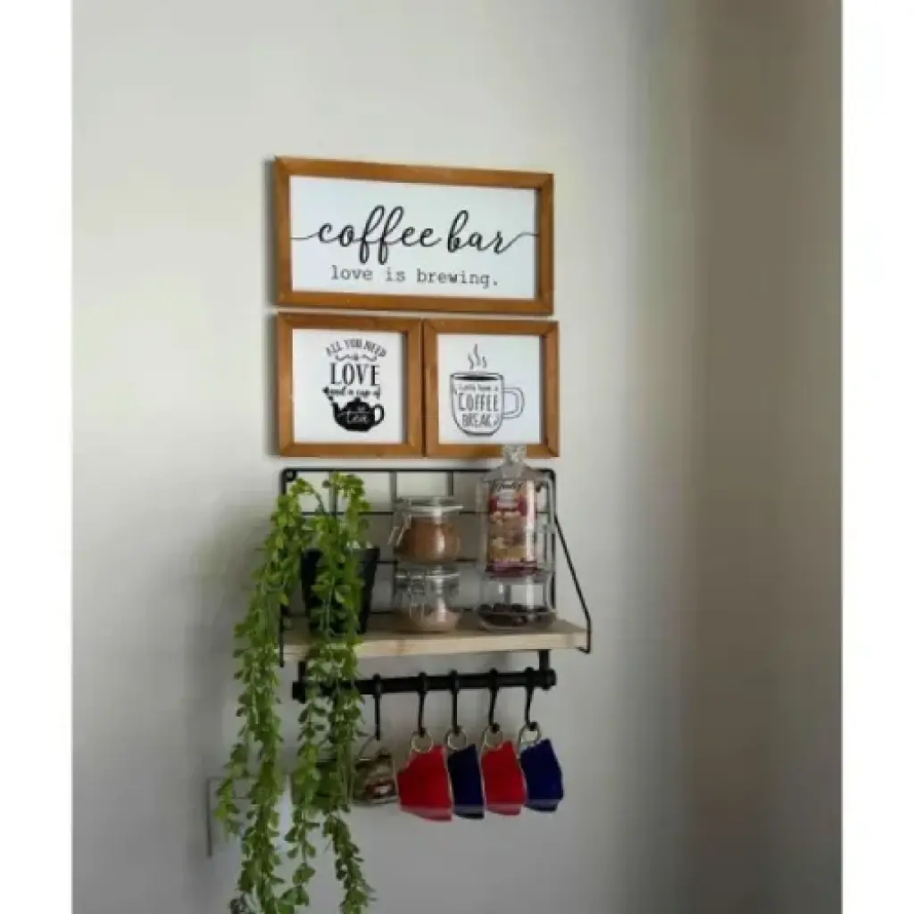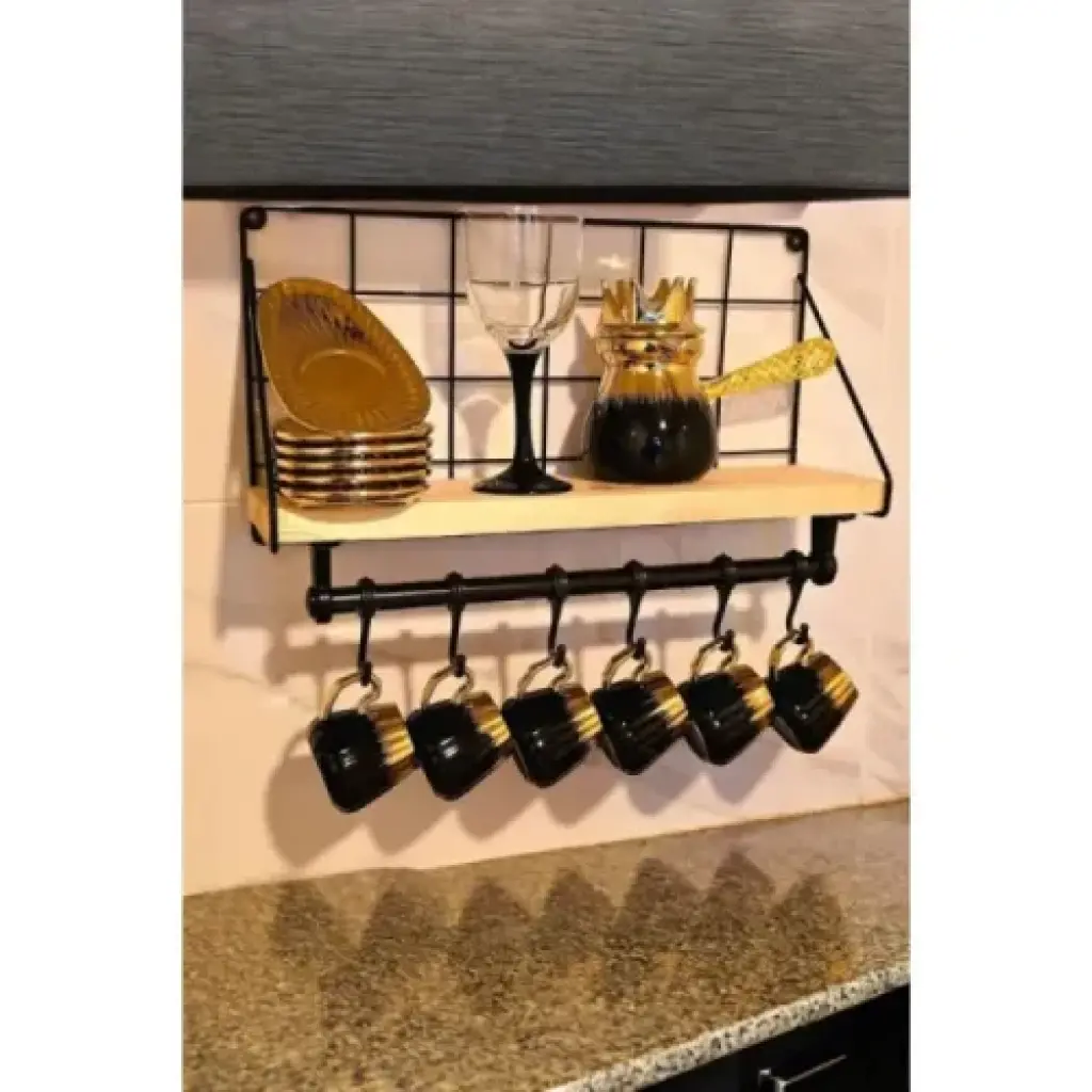 Metal Askılıklı Kahve Köşesi Rafı Metal askılıklı kahve köşesi rafı, mutfağınızda düzeni ve şıklığı bir arada sunar. Üst kısmı ahşap raf, alt kısmı ise metal boru üzerine yerleştirilmiş 6 adet sağlam askılıktan oluşur. Duvara monte edilebilen bu dekoratif düzenleyici, kahve fincanlarınızı, küçük tabakları, kavanozları ve mutfak aksesuarlarını estetik bir biçimde sergilemenize olanak tanır. Mutfak tezgâh üstü alanlarda veya kahve köşelerinde fonksiyonel ve modern bir görünüm yaratır. Metal iskeleti sayesinde uzun ömürlü kullanım sağlar. Az yer kaplayan tasarımı ile dar alanlarda bile pratik çözümler sunar.