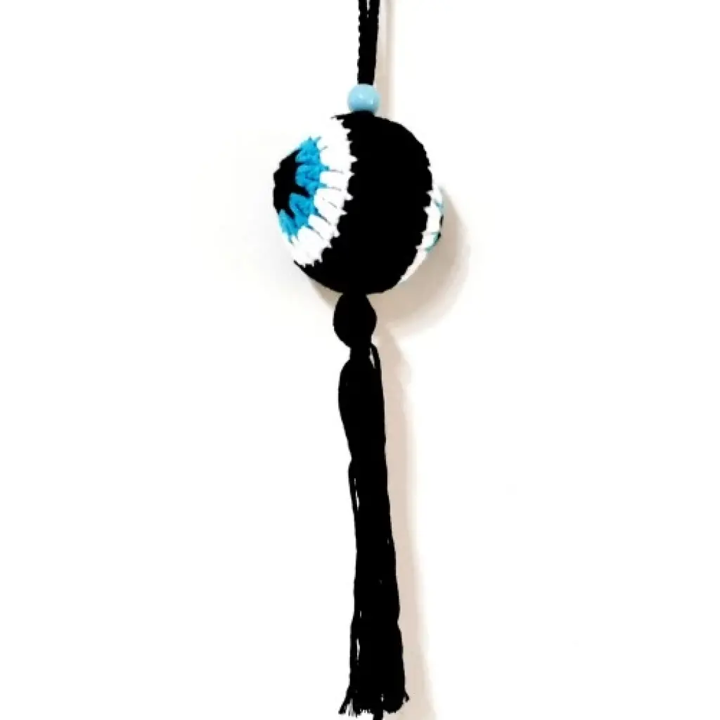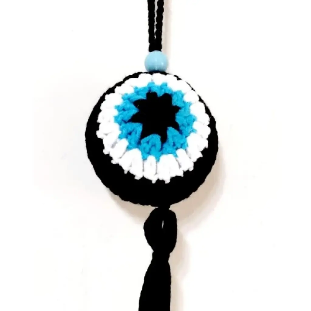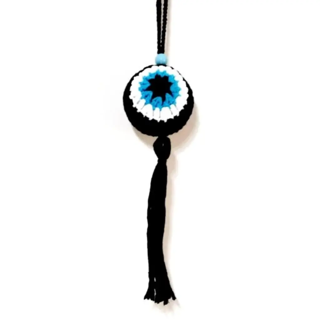 Nazar boncuğu desenli el örgüsü ürünümüz siyah orlon ip ile üretilmektedir. Püsküllü araba süsümüzün yuvarlak kısmı 7 santimetre çapındadır. Ürünümüz 23 santimetre boyundadır.