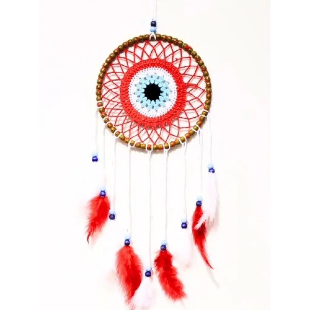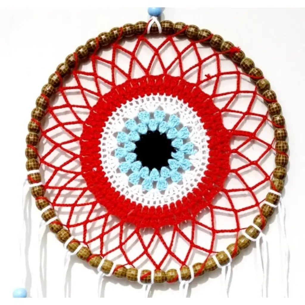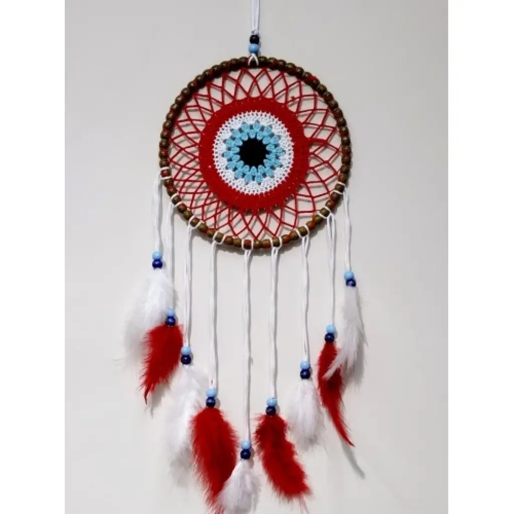 Nazar boncuğu desenli ürünümüz el yapımıdır. Ürünümüzün yuvarlak kısmı 22 santimetre çapındadır. Ürünümüz asma ipi dahil 70 santimetre boyundadır. Duvar süsümüz beyaz ve kırmızı kuş tüyleri ile süslenmiştir. Duvar süsümüzü en özel köşelerinizde kullanmak için ya da hediye etmek için tercih edebilirsiniz.