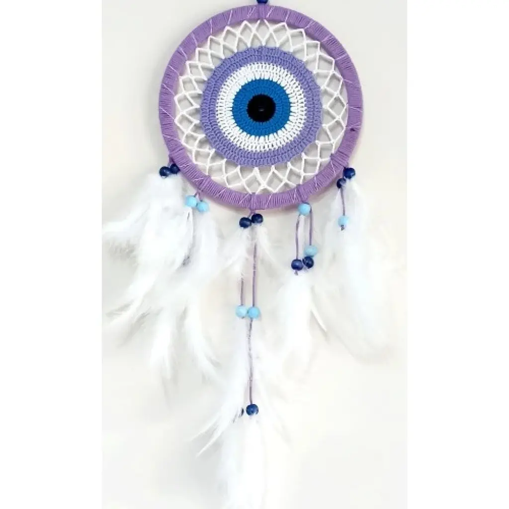 Lila rengi duvar süsümüzün yuvarlak kısmı 21 santimetre çapındadır. Ürünümüz ip dahil 68 santimetre boyundadır. Ürünümüz nazar boncuğu motifli olup el yapımıdır.