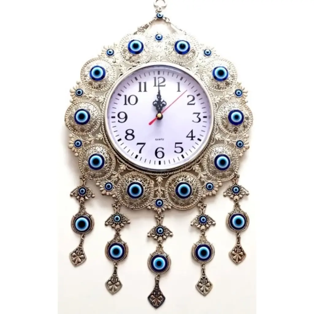 Gümüş kaplama mavi nazar boncuklu duvar saatimiz zamanla kararma veya bozulma yapmaz gümüş kaplama duvar saatimizin eni 28 santimetre, boyu 47 santimetredir.