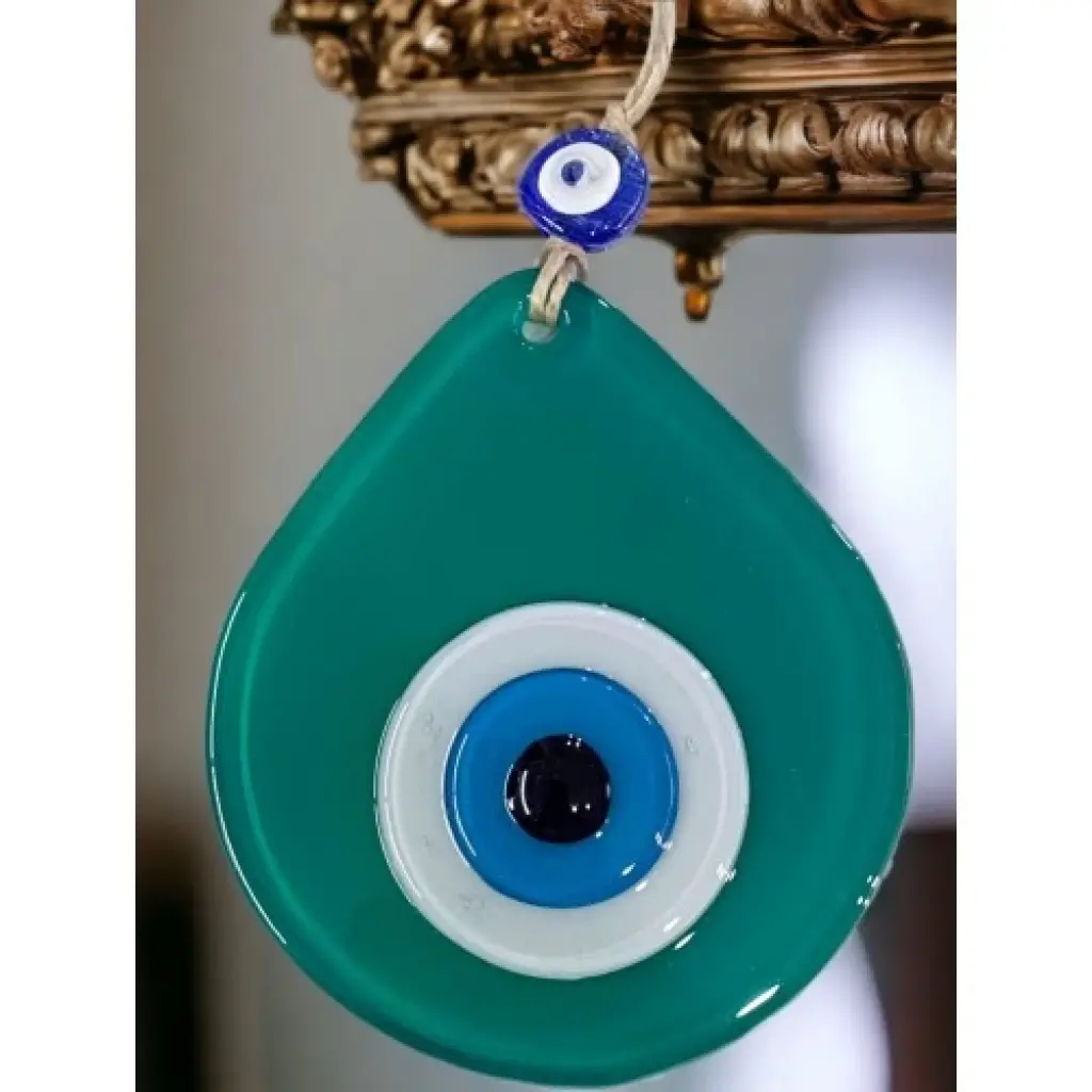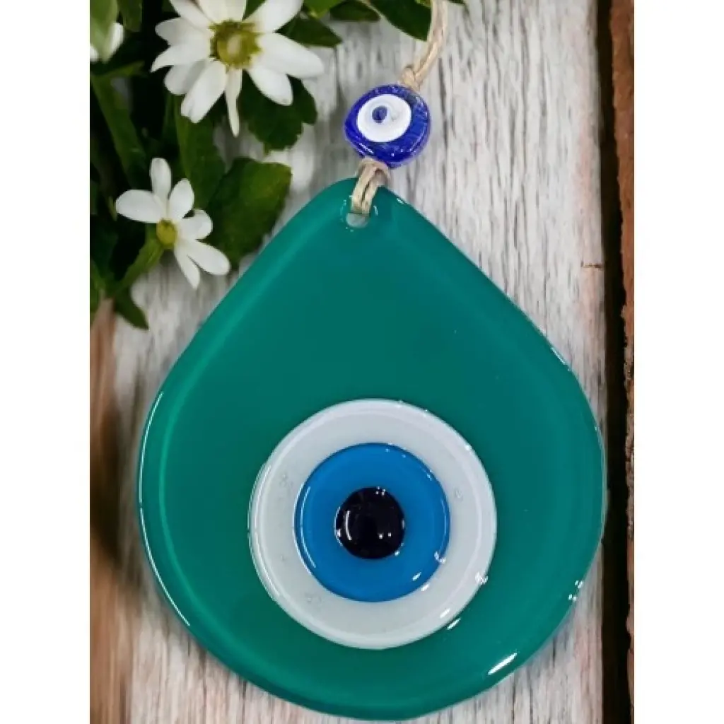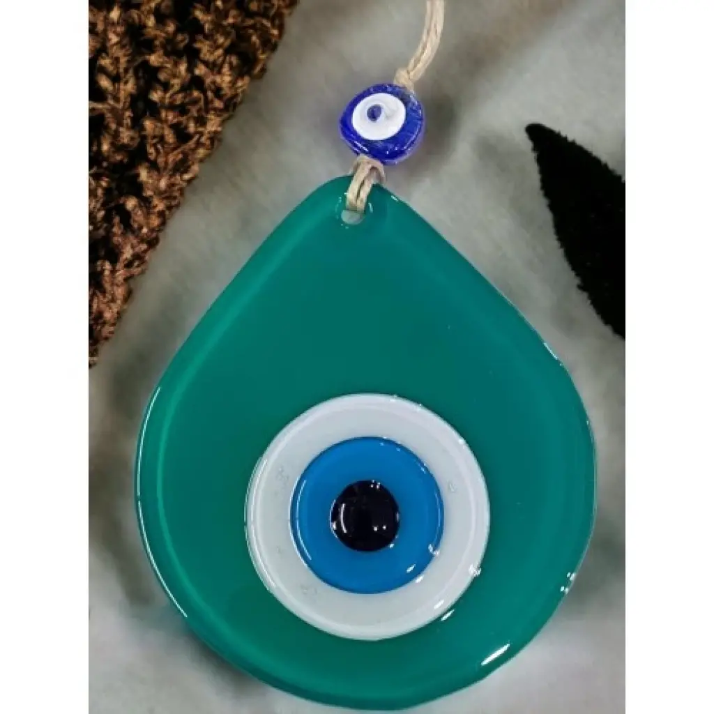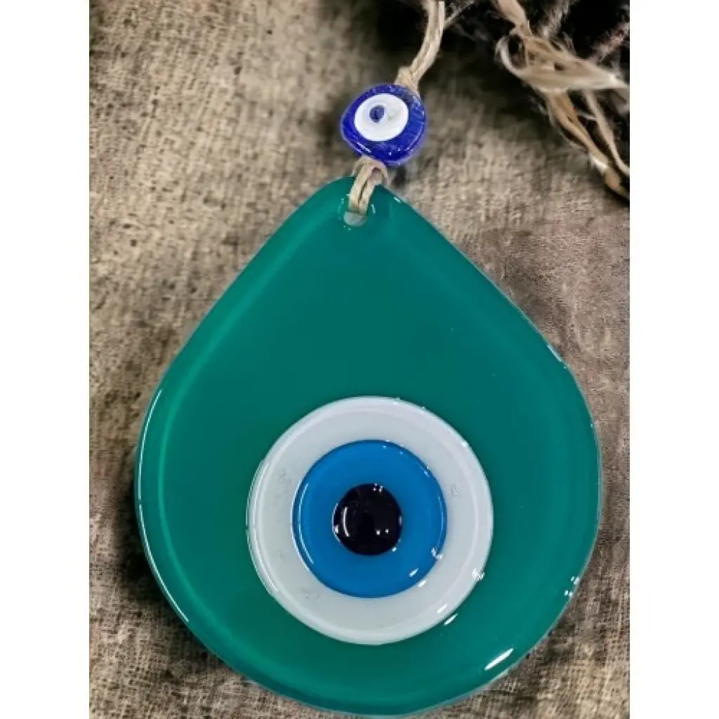 Mini yeşil renk nazar boncuklu duvar süsümüz tamamen el işçiliği ile üretilmiştir. Tasarım harikası el yapımı nazar boncuklu duvar süsümüz 10 x 12 santimetre ölçülerindedir. Ürünümüz ip dahil 21 santimetre boyundadır.