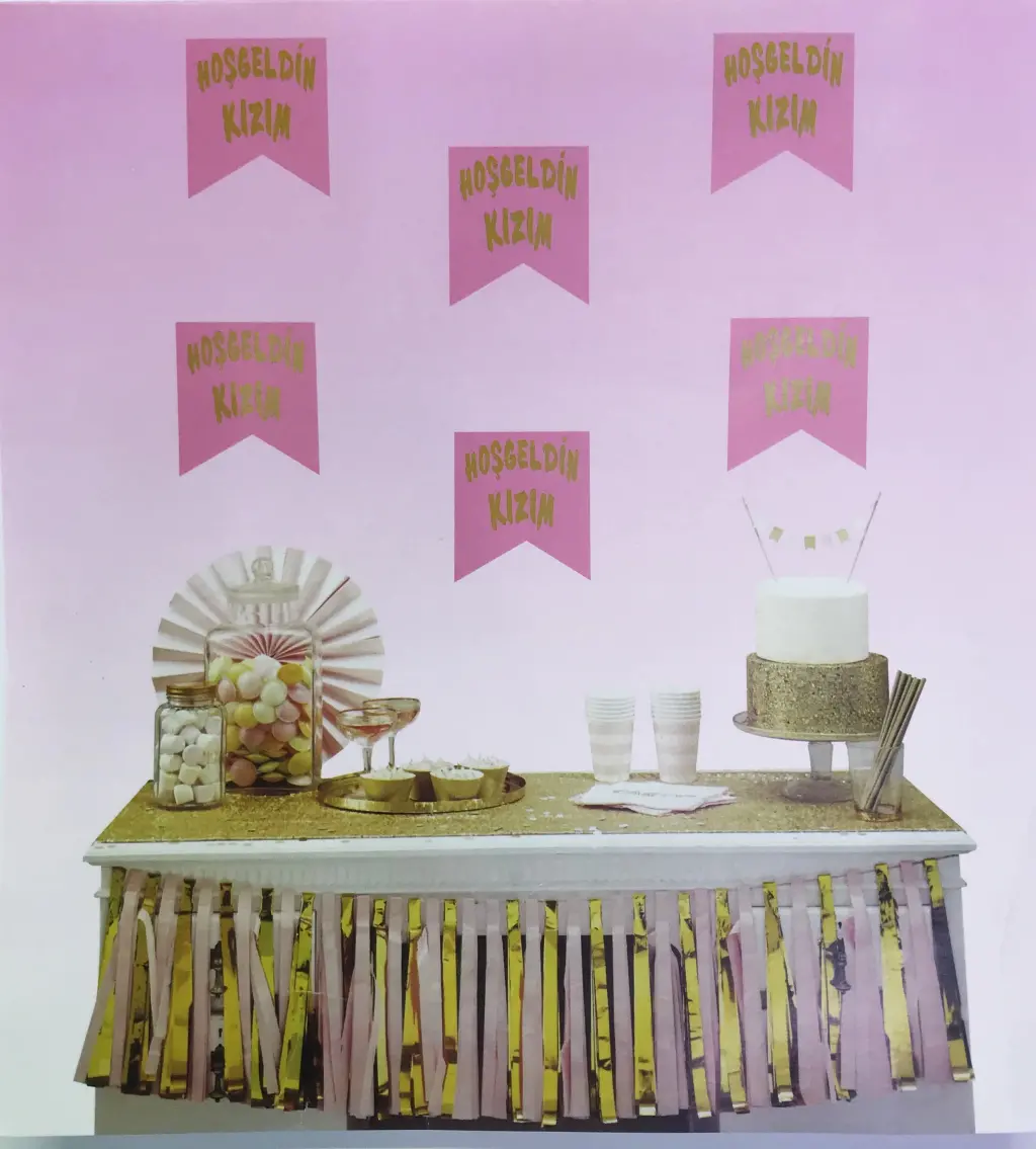 Hoşgeldin Kızım Yazılı Flama Süs Pembe Üzeri Altın Renk