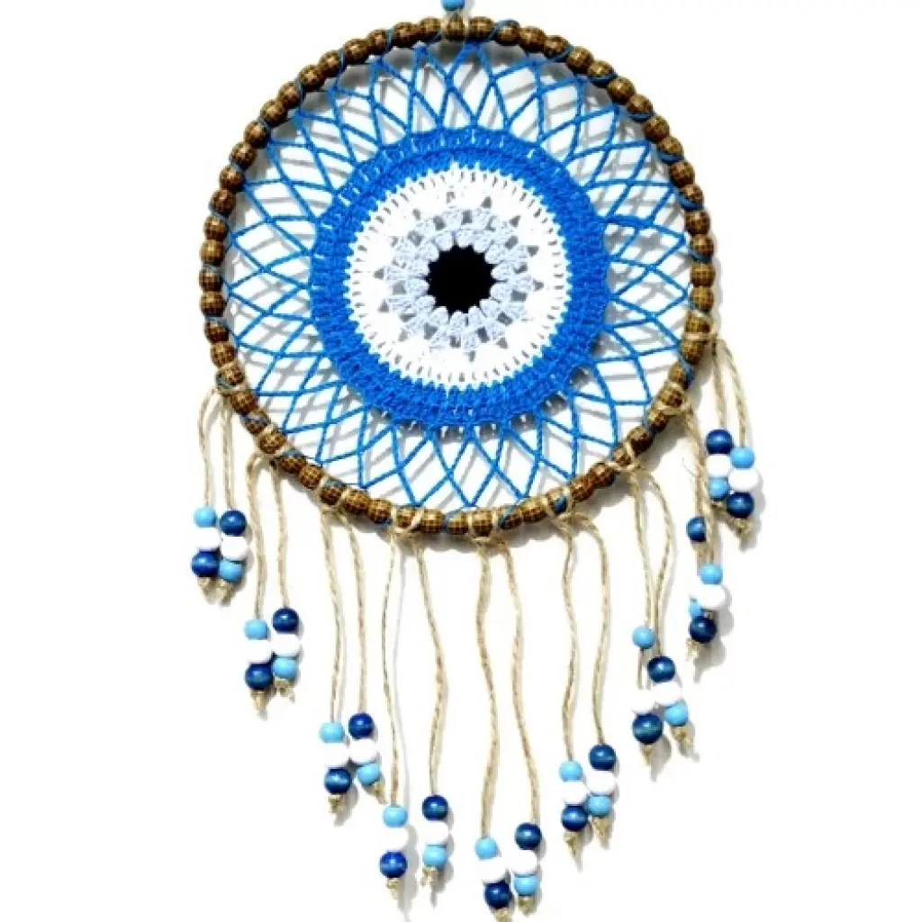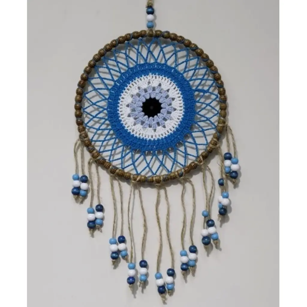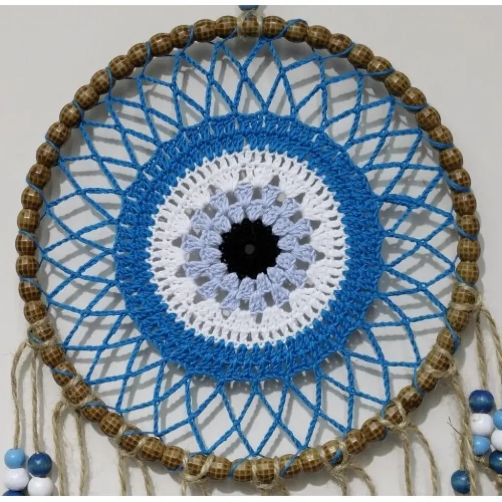 Petrol mavisi renginde örgülü duvar süsümüz el yapımıdır. Ürünümüzde birinci kalite malzeme kullanılmaktadır. Ürünümüzün yuvarlak kısmı 21 santimetre çapındadır. Ürünümüz ip dahil 58 santimetre boyundadır. Ürünümüz renkli boncuklarla süslenmiştir.
