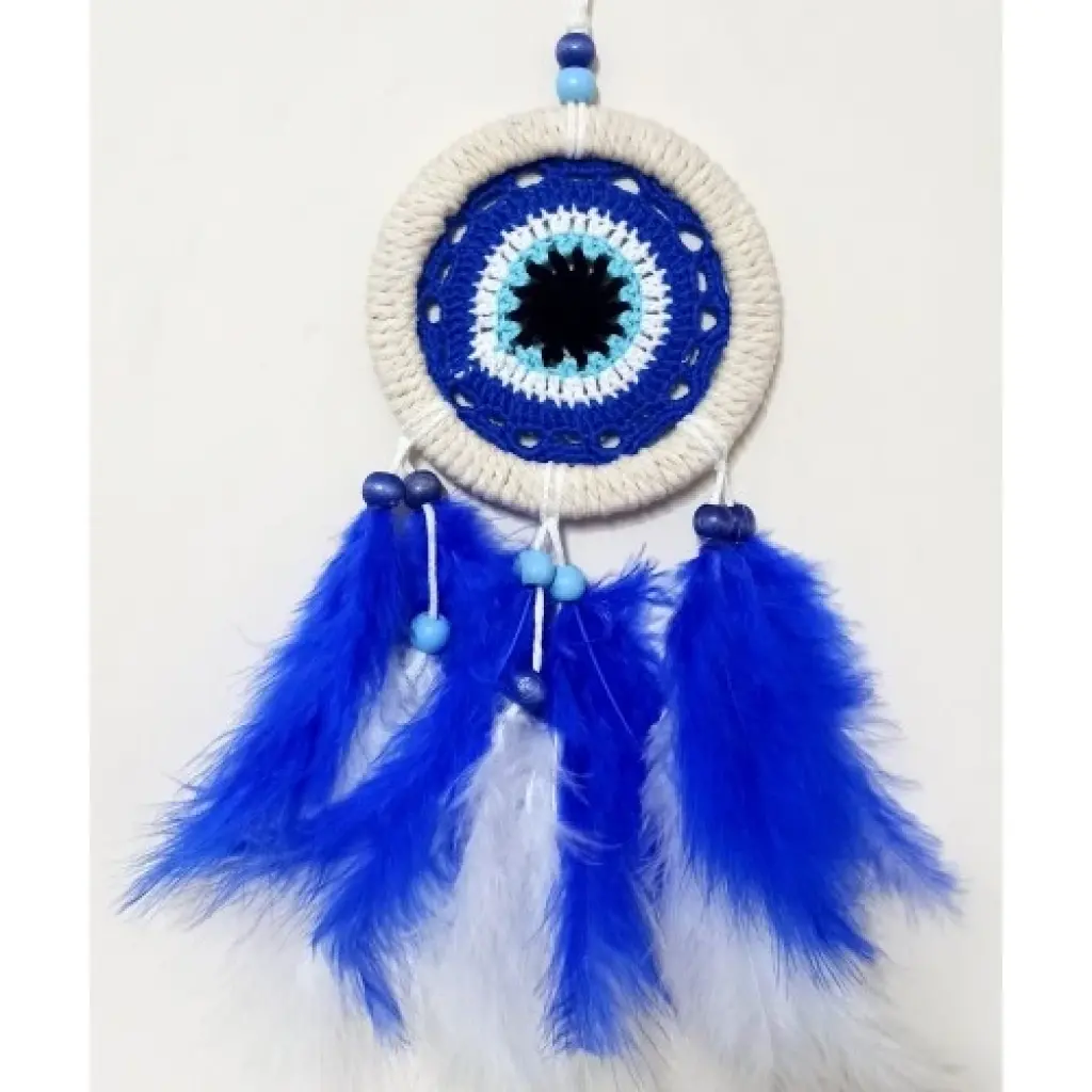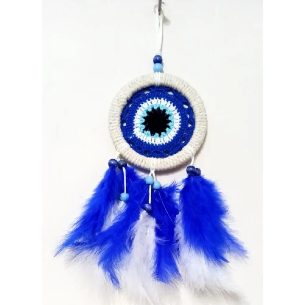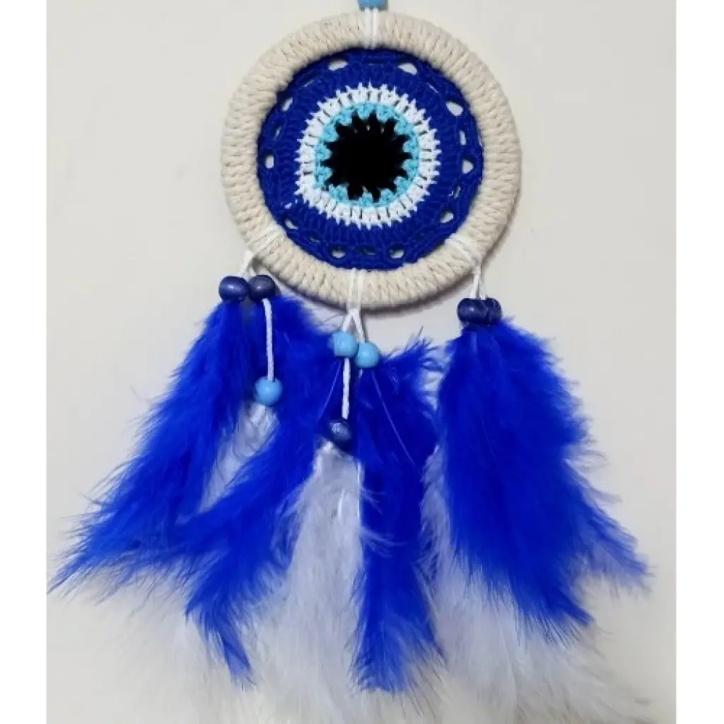 Nazar boncuğu motifli duvar süsümüz saks mavisi tüyler ile süslenmiştir. Duvar süsümüz el yapımıdır. Ürünümüzün yuvarlak kısmı 12 santimetre çapındadır. Ürünümüz ip ve tüyler dahil 40 santimetre boyundadır.