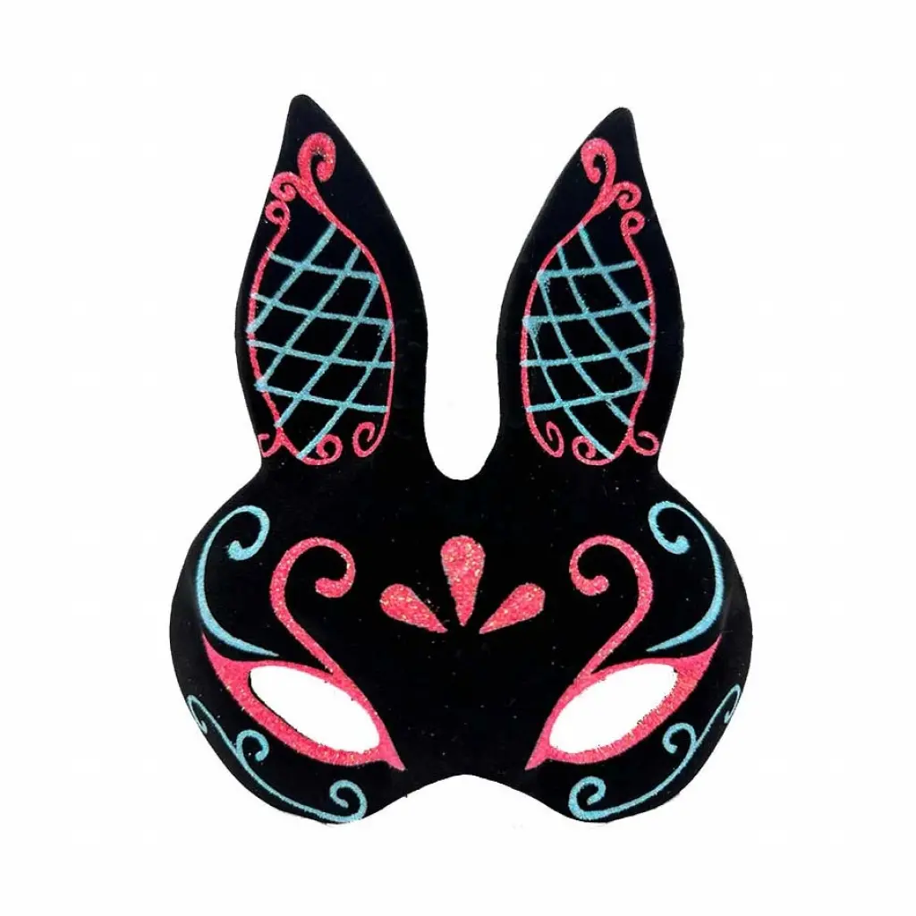 Gizemli ve göz alıcı bir görünüm için siyah süet kaplama, mavi kırmızı simli tavşan maskemiz tam size göre!