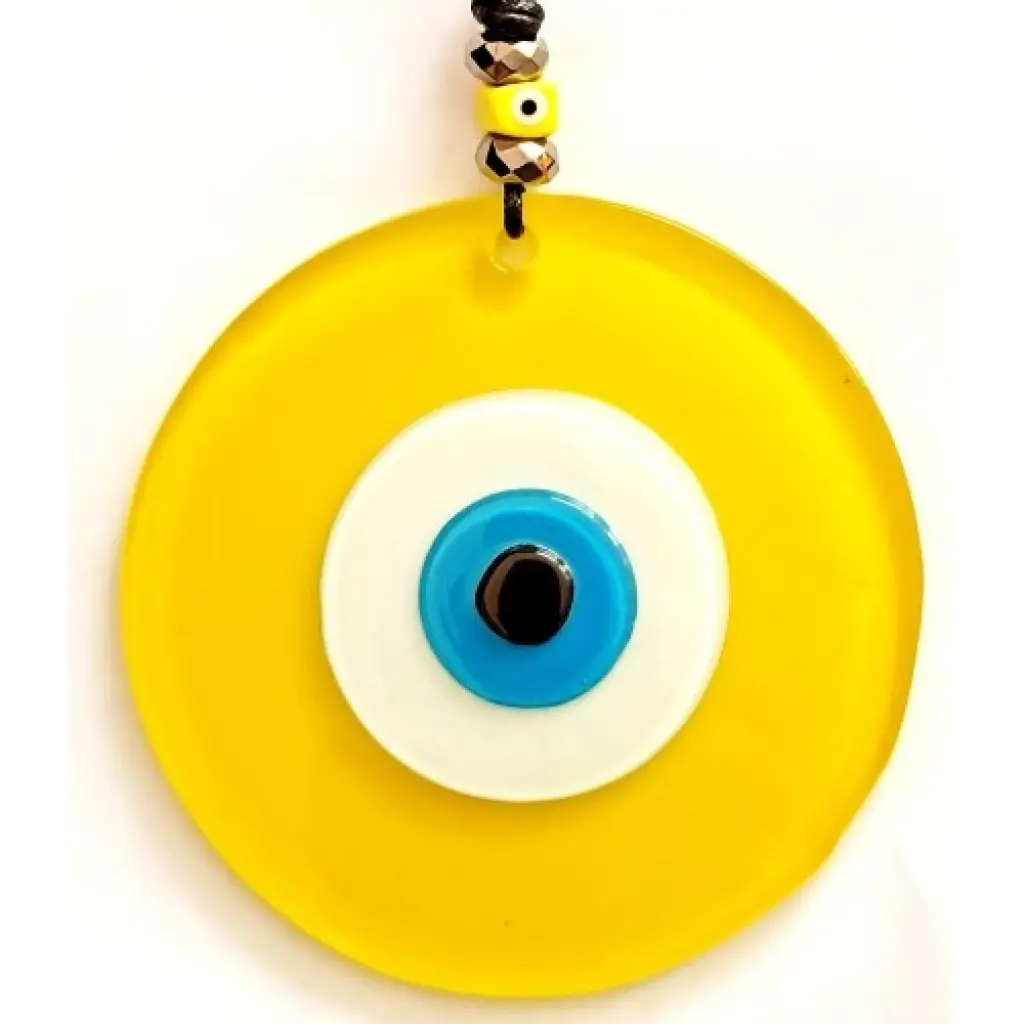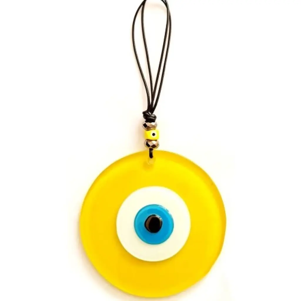 Sarı renk nazar boncuklu ürünümüz deri iplidir. Küçük cam nazar boncuk detaylıdır. Tamamen el işçiliği ile üretilmiş duvar süsümüz 12 x 12 santimetre ölçülerindedir. İp dahil toplam 26 santimetre boyundadır. Nazar boncuklu duvar süsümüz yaşadığı mekanlarda güneşin enerjisini hissetmek isteyenler için tasarlanmıştır.