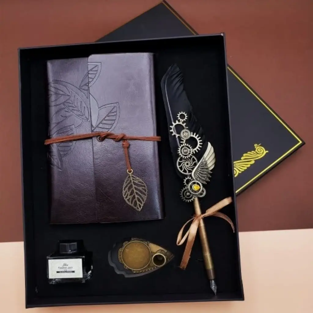 Tüylü Divit Hokka Kalem SetiTüylü kalem ve yanında bulunan yaprak tasarımlı deri defter ile set oldukça göz kamaştırmaktadır.Tüylü divit hokka kalem seti koyu rengi ile dikkat çekmekte olup çocuktan yetişkine herkesin hoşuna gideceği bir hediyedir.Divit hokka kalem seti sevdiklerinize verebileceğiniz en şık ve tasarımsal hediye setlerindendir.Son zamanların en trend divit hokka kalem çeşitlerinden olup oldukça beğenilen ürünlerden.Set içinde bulunan deri yaprak deseni defter ve tüylü kalemi ile hediye seti farklı bir görünüme sahip olmuştur. Divit Hokka Set Özellikleri:* Defter kaliteli deri malzemeden üretilmiştir.* Defter çizgisizdir.* Yaprak deri defter 75 yaprak olup 150 sayfadır.* Divit set içinde yer alan tüylü kalem metal uçludur.* Hediye setin içinde divit kalemin masaüstü tutucu aparatı yer almaktadır.* Set içerisinde kalemin mürekkepi yer almaktadır.* Özel tasarım kutusuyla gönderilmektedir.Özel Hediye Seti, Divit Hokka Kalem Seti Ölçüleri:Deri Hatıra Defter Ölçüsü: 18.5 cm x 12.5 cmDivit Tüylü Kalem Ölçüsü: 25 cm Divit kalem masaüstü tutucu: 6.5 cm x 4 cm