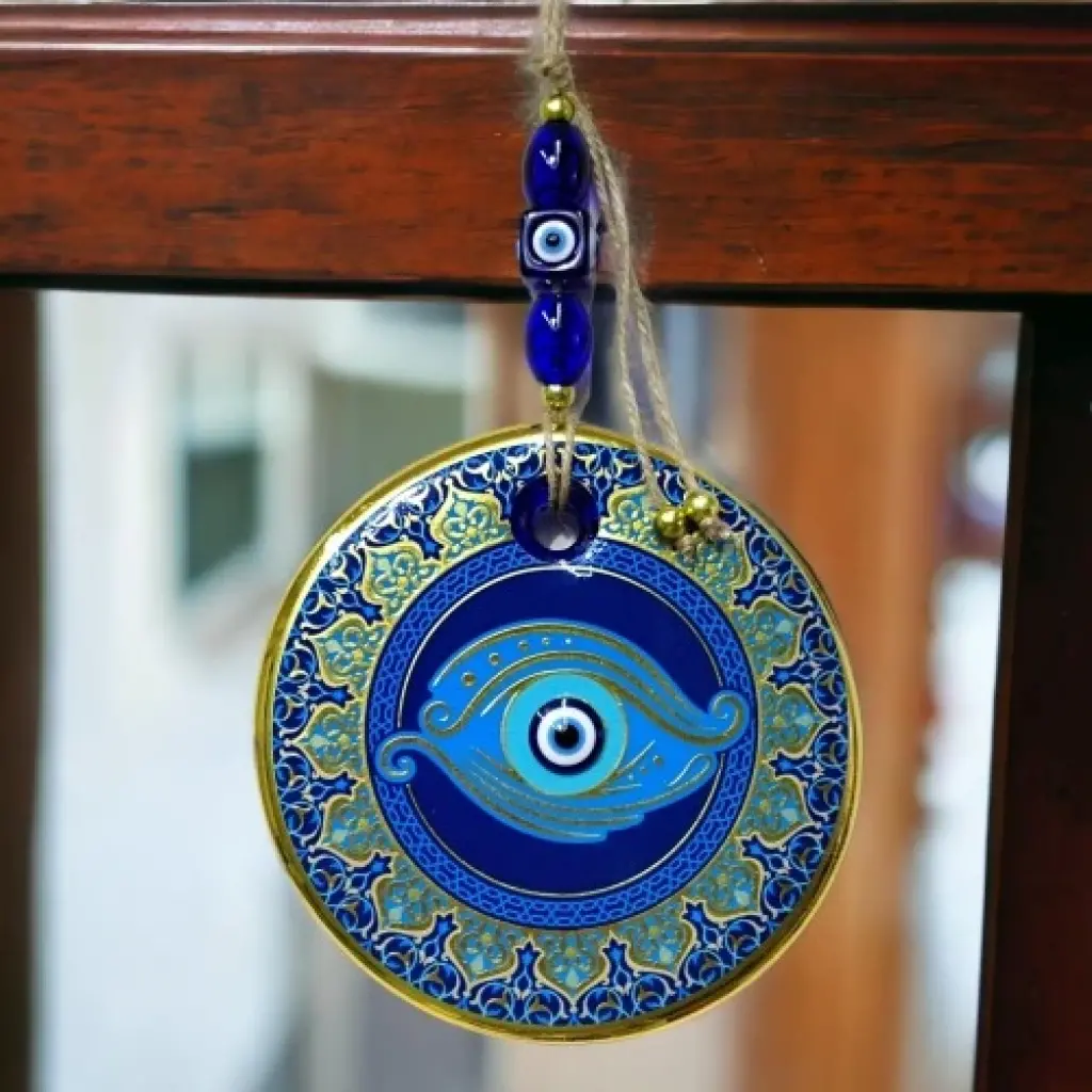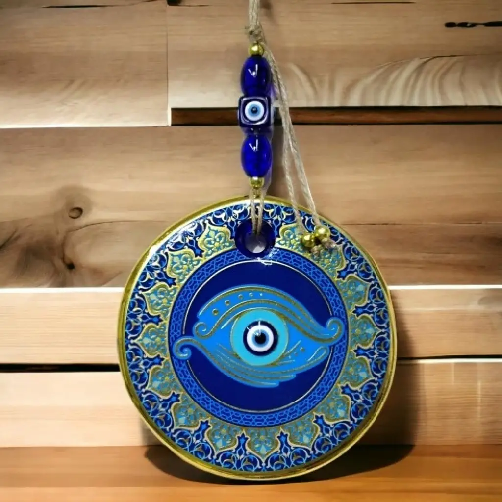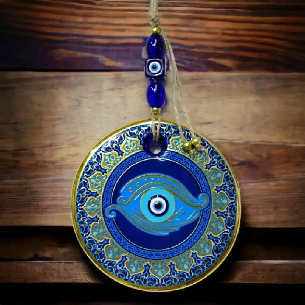 Altın rengi kaplamalı duvar süsümüz nazar boncuğu ile süslenmiştir. Ürünümüz mavi cam nazar boncuğundan tamamen el işçiliği ile üretilmiştir. Ürünümüzün yuvarlak kısmı 13 santimetre çapındadır. Duvar süsümüz ip dahil yaklaşık 30 santimetre boyundadır.