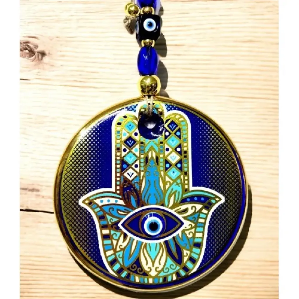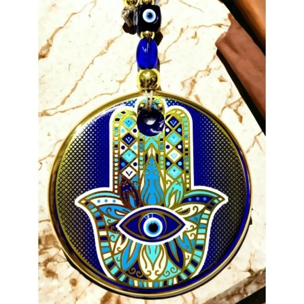 Fatma Ana eli duvar süsümüz nazar boncuğu ile süslenmiştir. Ürünümüz mavi cam nazar boncuğu kullanılarak el işçiliği ile üretilmiştir. Ürünümüzün yuvarlak kısmı 13 santimetre çapındadır. Duvar süsümüz ip dahil yaklaşık 30 santimetre boyundadır.