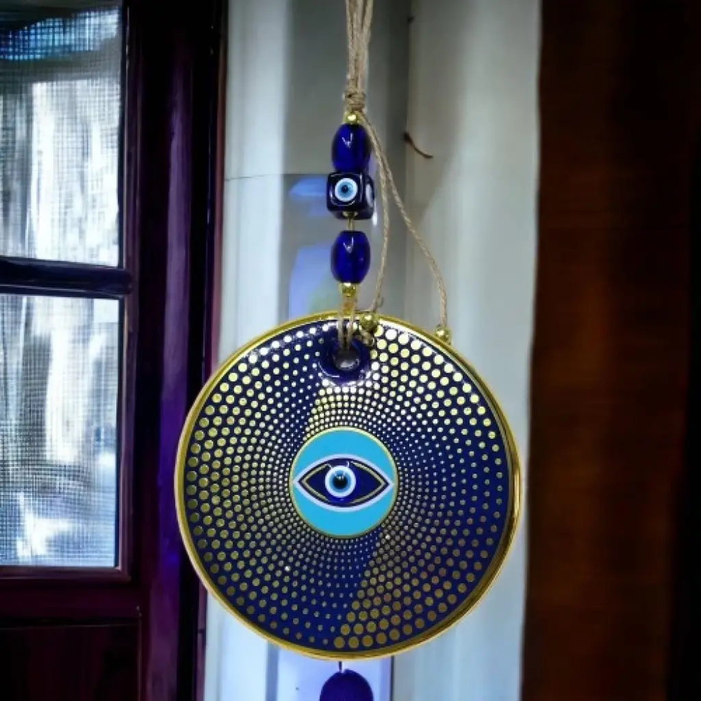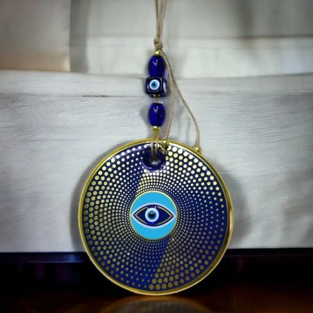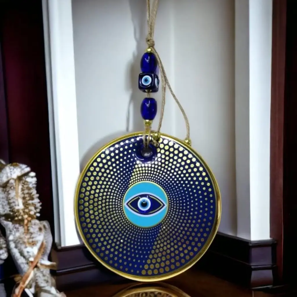 Altın rengi kaplamalı duvar süsümüz nazar boncuğu ile süslenmiştir. Ürünümüz mavi cam nazar boncuğundan tamamen el işçiliği ile üretilmiştir. Ürünümüzün yuvarlak kısmı 13 santimetre çapındadır. Duvar süsümüz ip dahil yaklaşık 30 santimetre boyundadır.