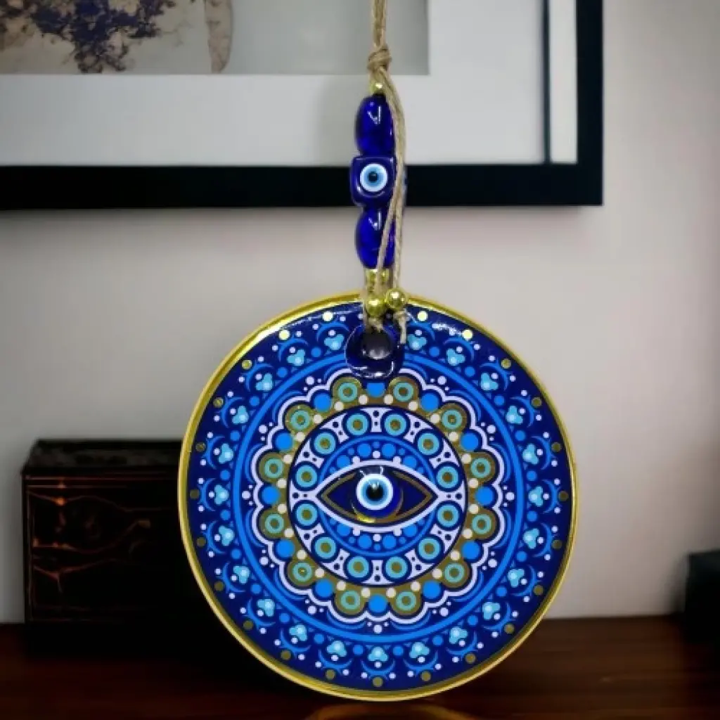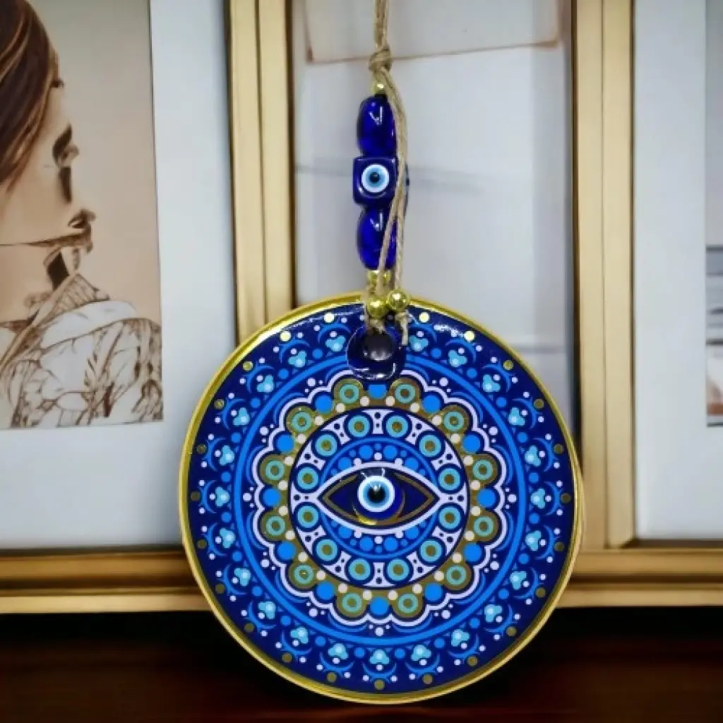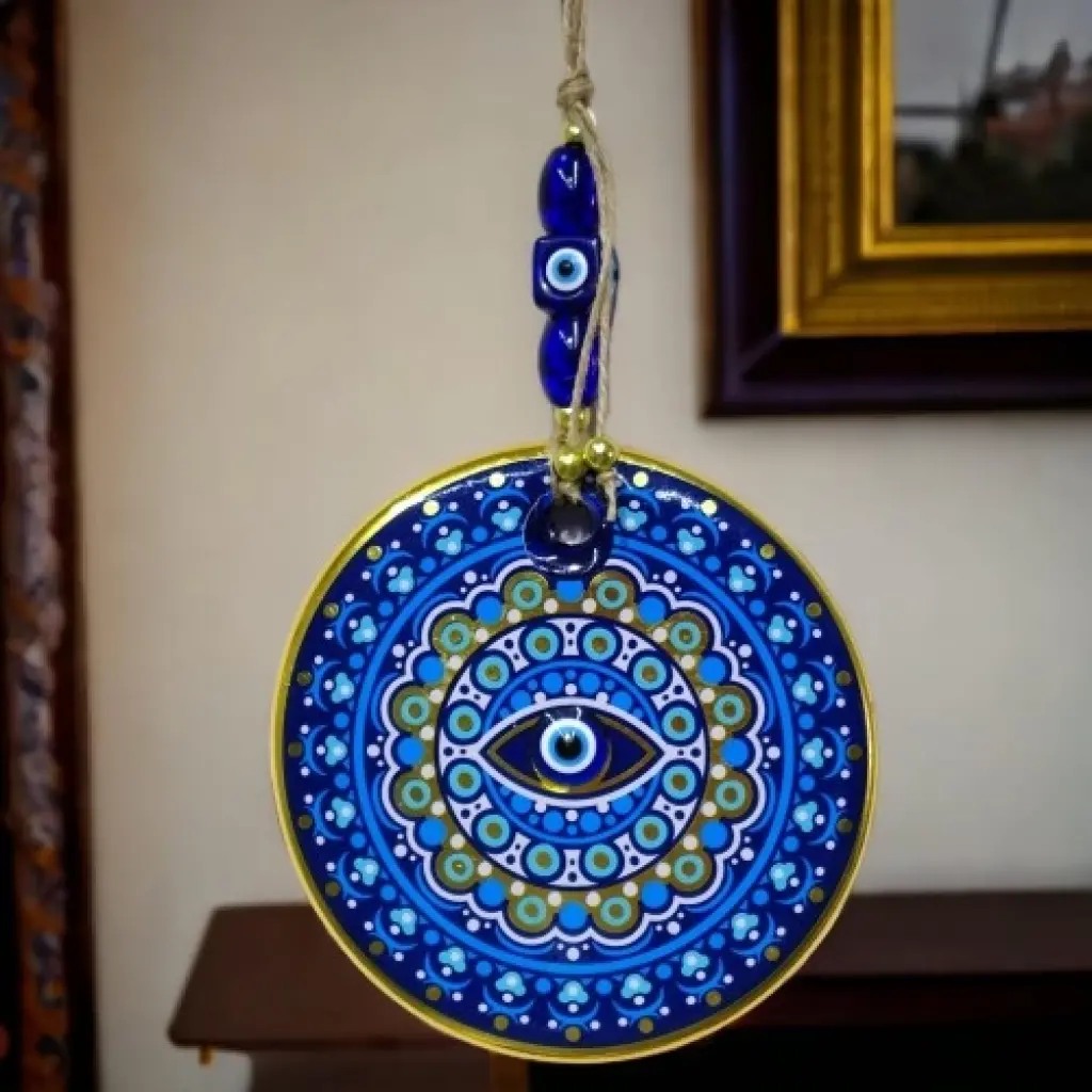 Puantiye kaplamalı duvar süsümüz nazar boncuğu ile süslenmiştir. Ürünümüz mavi cam nazar boncuğundan tamamen el işçiliği ile üretilmiştir. Ürünümüzün yuvarlak kısmı 13 santimetre çapındadır. Duvar süsümüz ip dahil yaklaşık 30 santimetre boyundadır.
