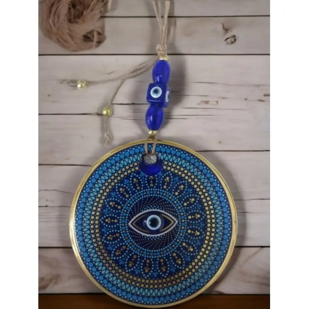Nazar boncuklu göz duvar süsümüz nazar boncuğu ile süslenmiştir. Ürünümüz mavi cam nazar boncuğundan tamamen el işçiliği ile üretilmiştir. Ürünümüzün yuvarlak kısmı 13 santimetre çapındadır. Duvar süsümüz ip dahil yaklaşık 30 santimetre boyundadır.