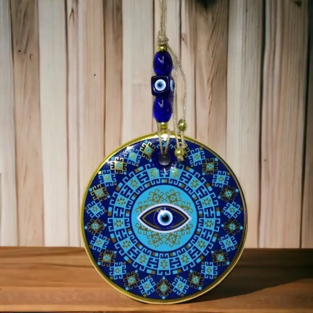 Nazar boncuklu göz duvar süsümüz nazar boncuğu ile süslenmiştir. Ürünümüz mavi cam nazar boncuğundan tamamen el işçiliği ile üretilmiştir. Ürünümüzün yuvarlak kısmı 13 santimetre çapındadır. Duvar süsümüz ip dahil yaklaşık 30 santimetre boyundadır.