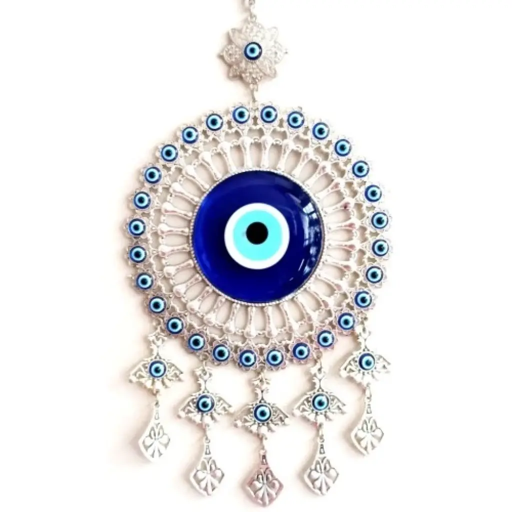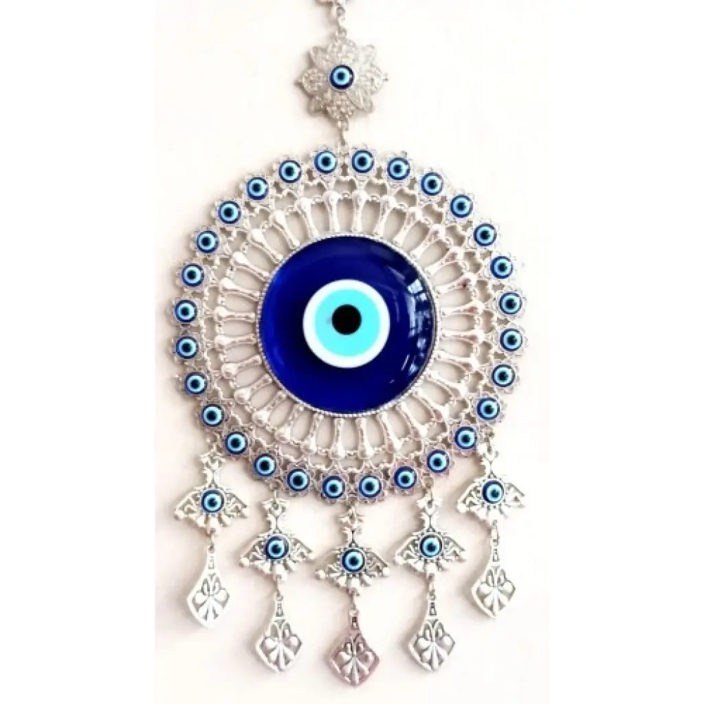 Nikel zamak kaplamalı nazar boncuğu duvar süsümüz 34x17 santimetre ölçülerindedir. En güzel köşelerinizde sıradışı farklılık yaratmak için yada sevdiklerinize en güzel en sıcak içimden geldi hediyesi almak için özel tasarım olarak üretilmiştir.